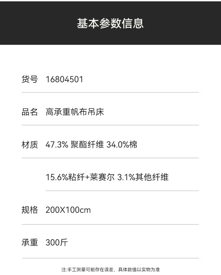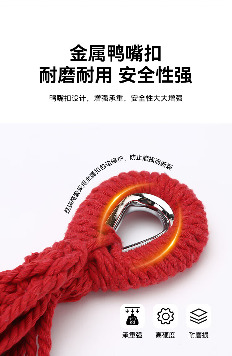 这个吊床大小合适,物流也很迅速,拆解都非常容易,质量也非常稳固,唯一不足就是有味道,需要散味,而且时间还有点长,希望厂家改进。