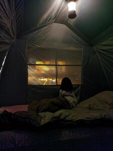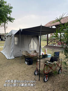 假日山居5.9黑胶帐篷⛺️趁着周六天气好赶紧开帐过夜 帐篷大小适合一家三口,放一个1.5米的充气床垫还有很多活动位置(见图3),晚上睡觉加放一个小朋友睡的单人床垫就基本没啥位置了哟。 假日山居黑胶版相比老版多一截可以用拉链拼接的天幕,这块天幕白天做前厅拓展,晚上可以当幕布看电影(见图4和5),嘿嘿,一物多用! 黑胶版遮光效果好很多,第二天一觉醒来8点,帐篷里面黑漆漆的[哇R] 另外保暖效果也不错,晚上12度的晴朗天气,在里面有点热,睡袋直接拆成被子盖刚好。