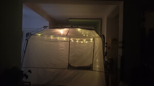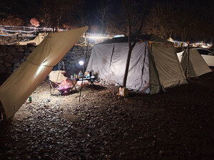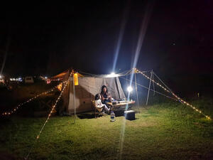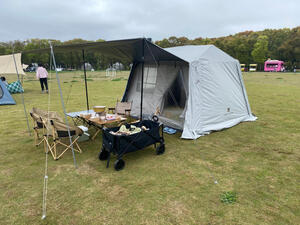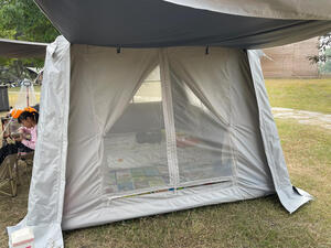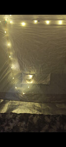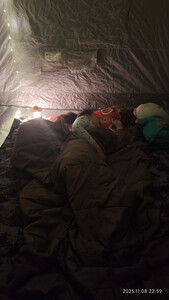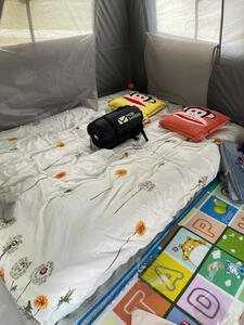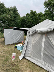 自己配了两根伸缩杆支撑侧帐,正面侧面都打开真的空间大,进出也方便很多! 最绝的是升级以后的延长幕布,我们晚上遇到了小雨,直接拉链延长幕布,风绳固定好,因为正好是向下的,所以雨水全部流走也不会积水,而且防雨真的很好。 早上睡到快九点但是帐篷里还是黑漆漆的,黑胶版这点也是真香。 空间三个人足够,放了1.5的充气床周围还有好多的空间,甚至觉得空间有点过多了有点奢侈😂 总体来说很值得,很完美!