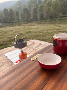 桌板很有质感,图中就是拍的实地照片,偶尔轻量户外下午茶可以当桌子了,当然担心炉子过热还是放在防火垫上,就没放在桌板上了。总体来说,虽然比较贵,但是和那些桌板比,确实物超所值,因为质感真不一样,很厚实的,做工也好。