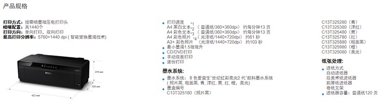 | 墨盒编号 | C13T325180(照片黑) C13T325280(青) C13T325380(洋红) C13T325480(黄) C13T325780(红) C13T325880(粗面黑) C13T325980(橙) C13T325080(亮光) |