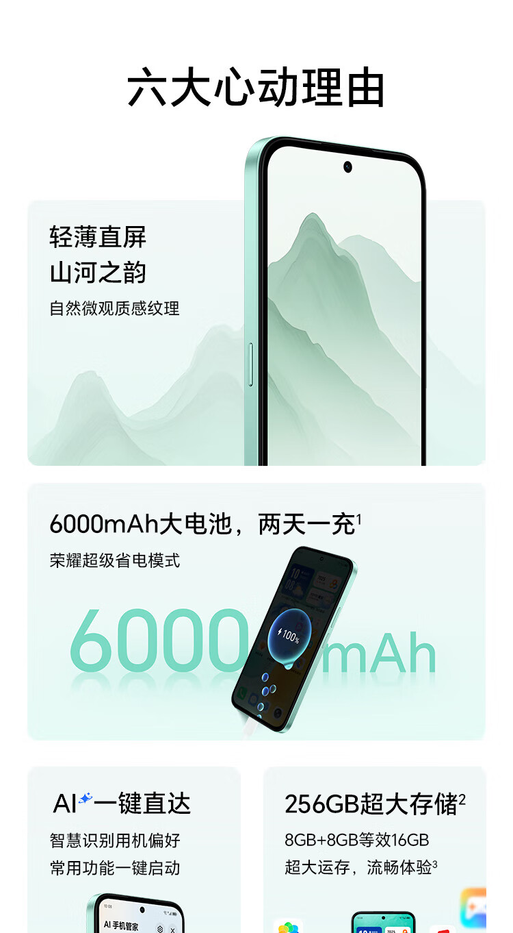 荣耀畅玩60 5G全网通 【全新正品】手机 6000mAh超能大电池 AI一键直达 整机抗摔防水 6.61英寸直面屏 晓山青 8GB+256GB