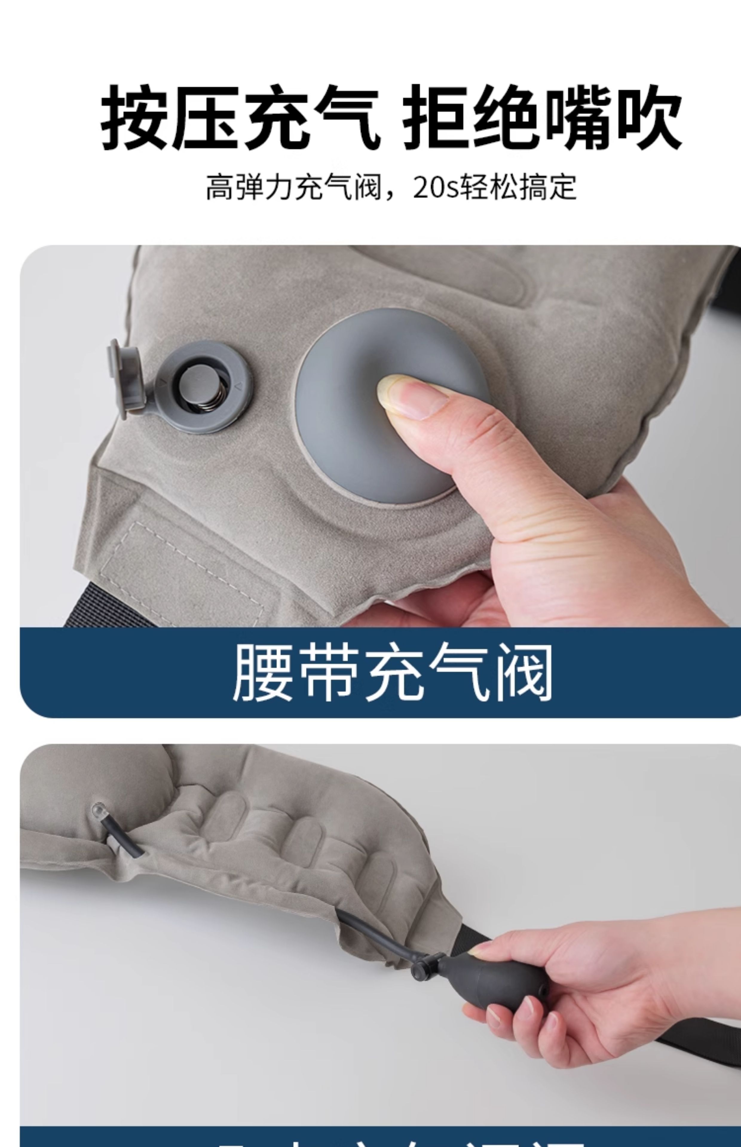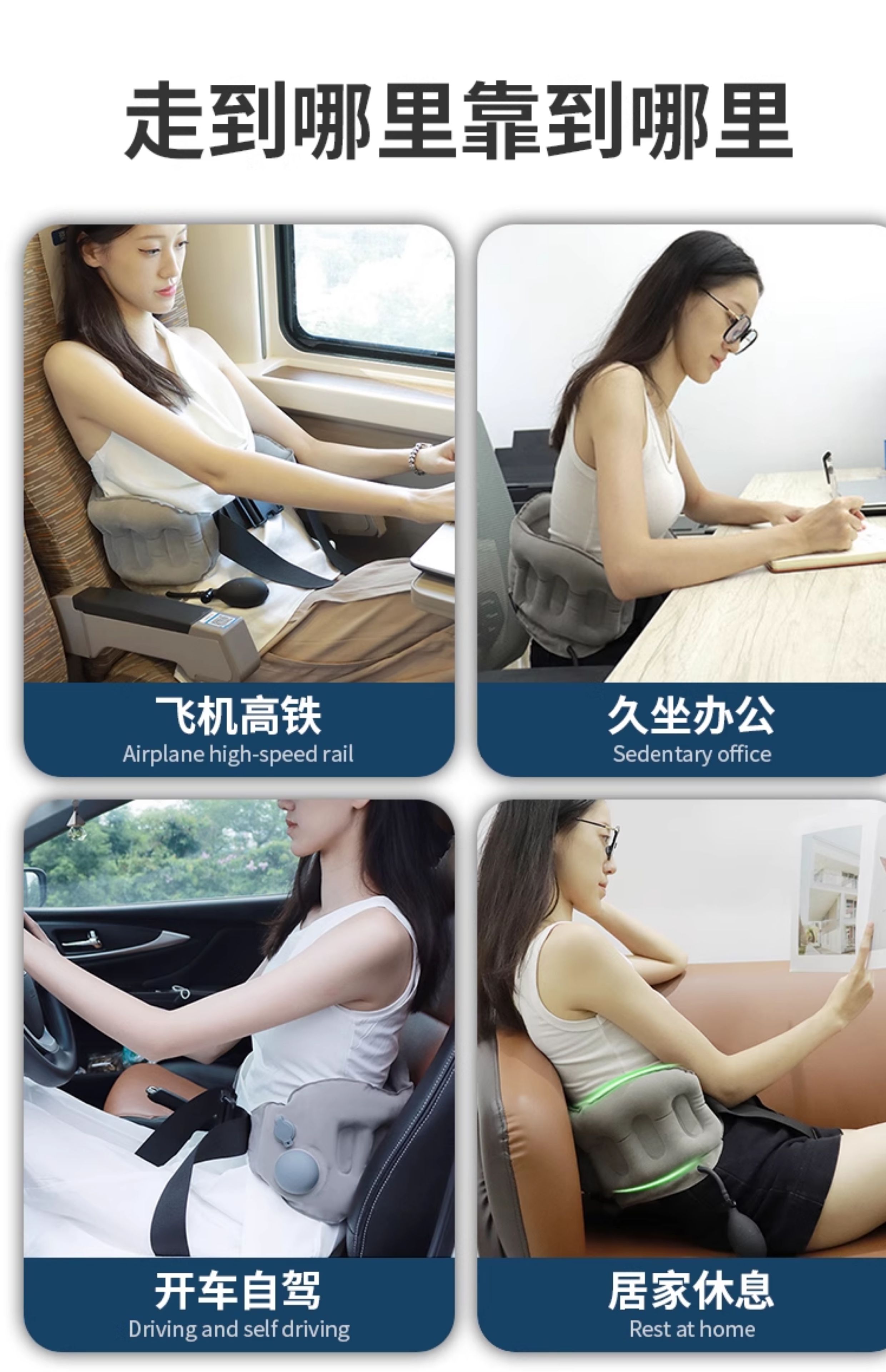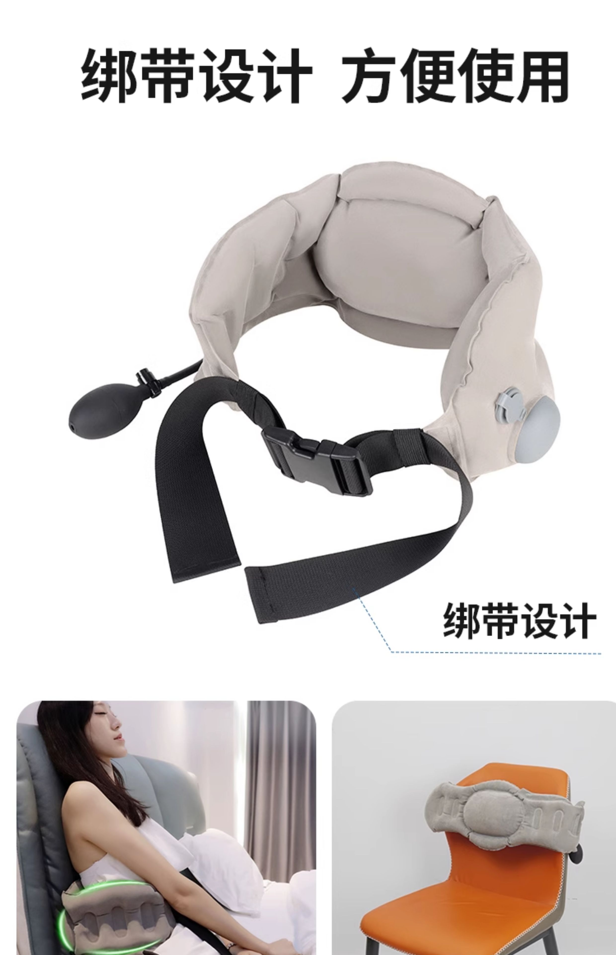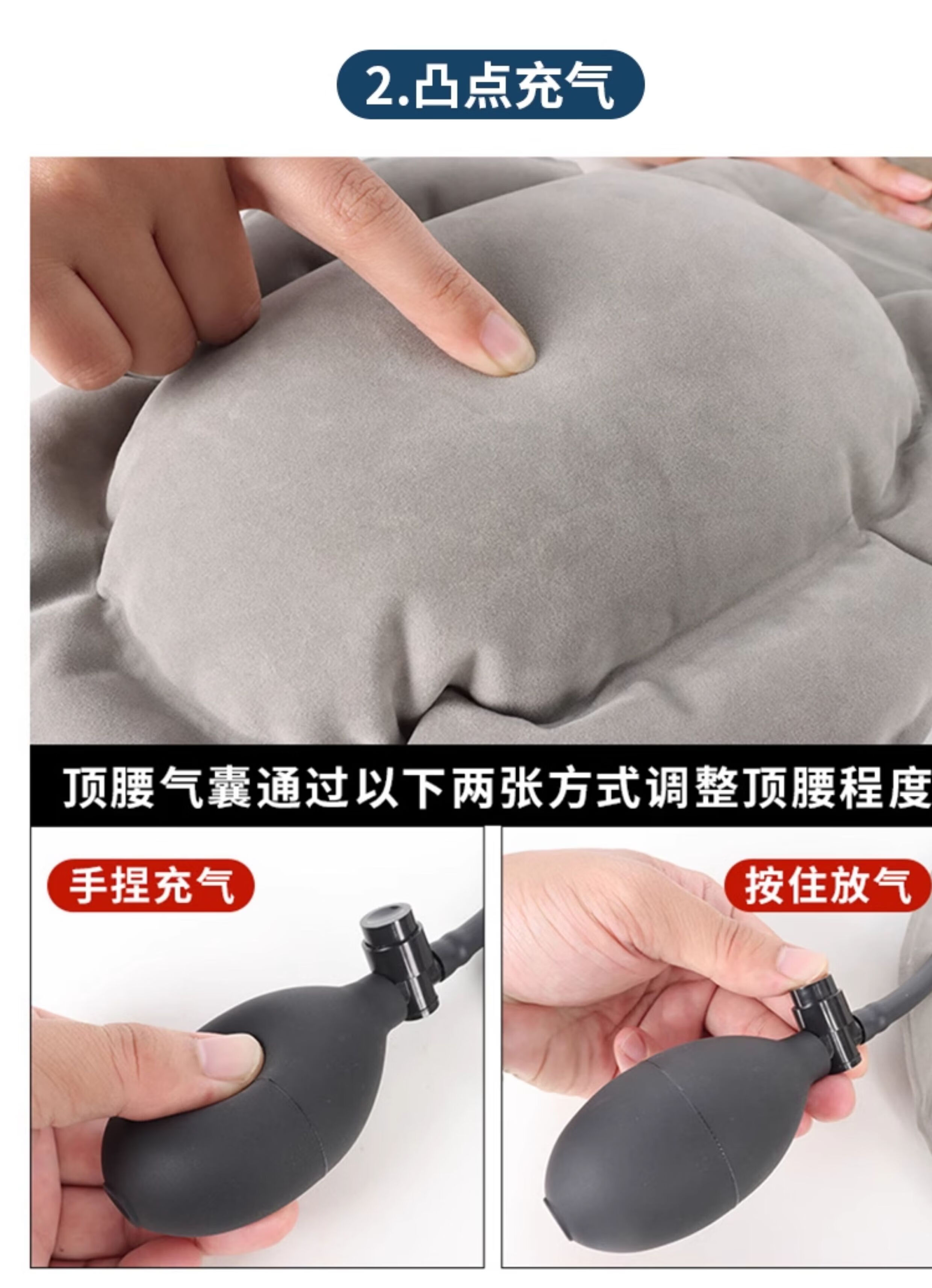 面料比较好,没异味不容易脏,靠着也舒服,整体支撑力较强,能缓解出门坐车的时候腰酸背疼,充气的出门带着也方便,往包里一放就行,充气也快,半分钟就充好了