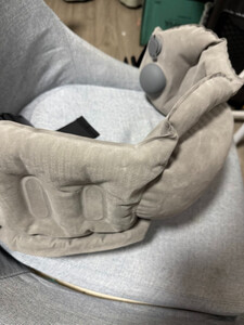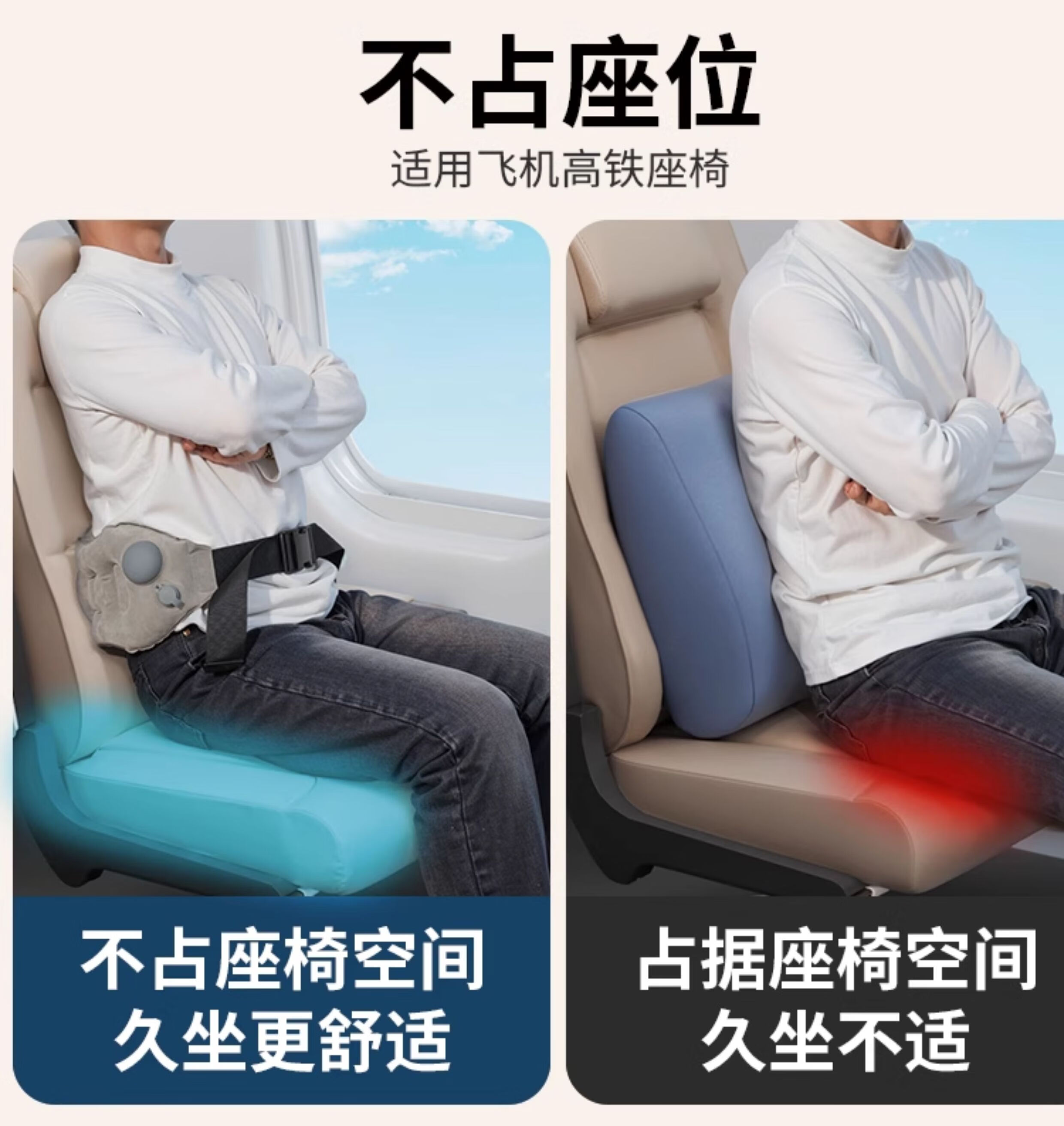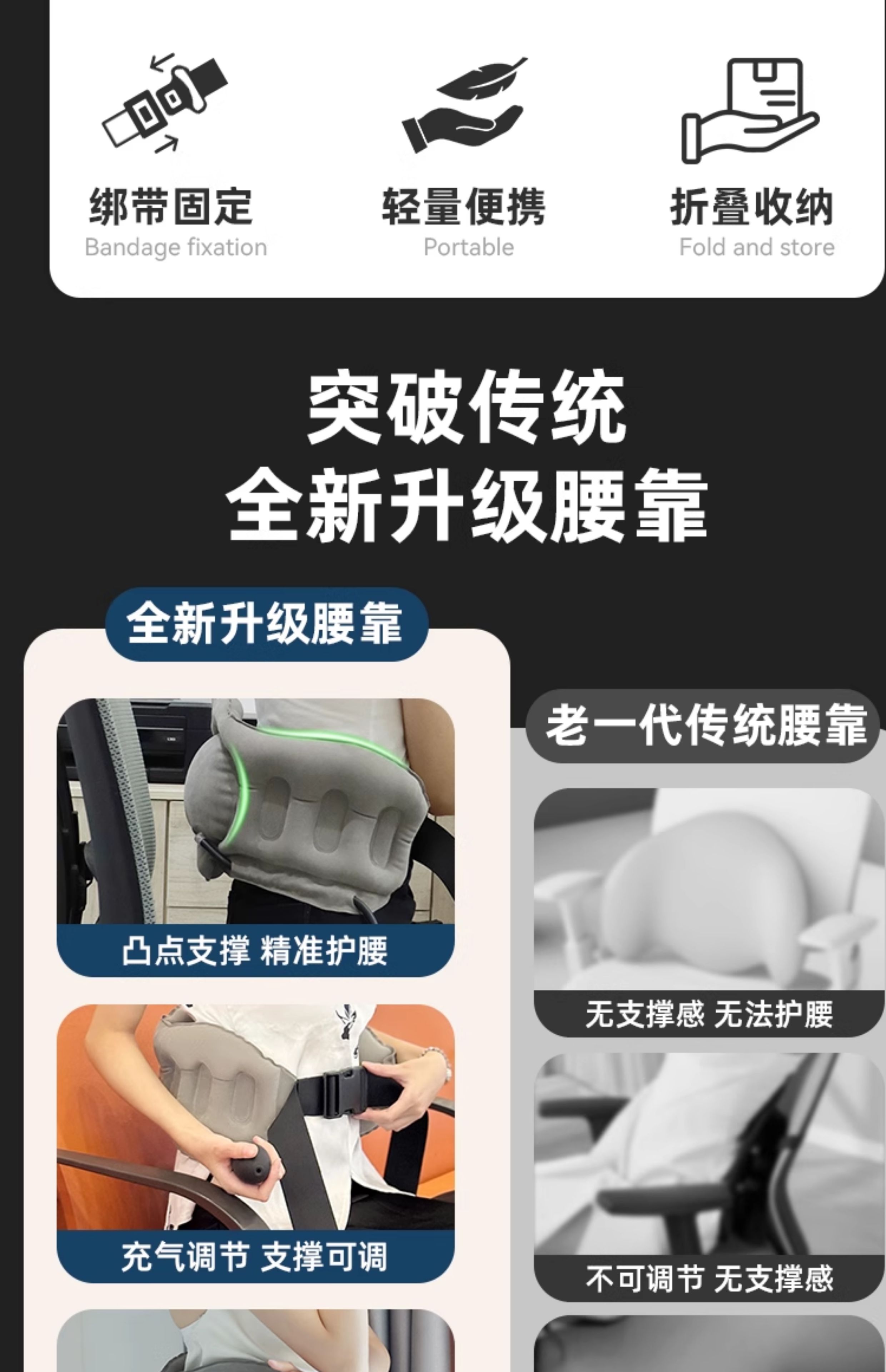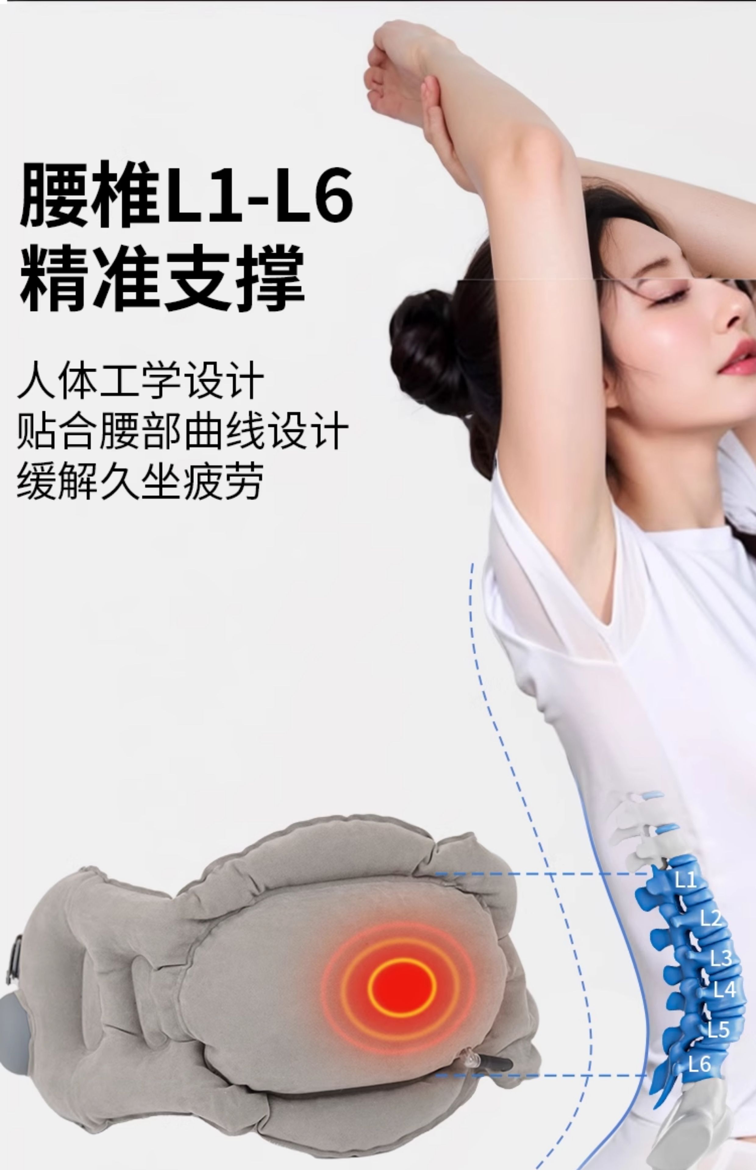 面料比较好,没异味不容易脏,靠着也舒服,整体支撑力较强,能缓解出门坐车的时候腰酸背疼,充气的出门带着也方便,往包里一放就行,充气也快,半分钟就充好了