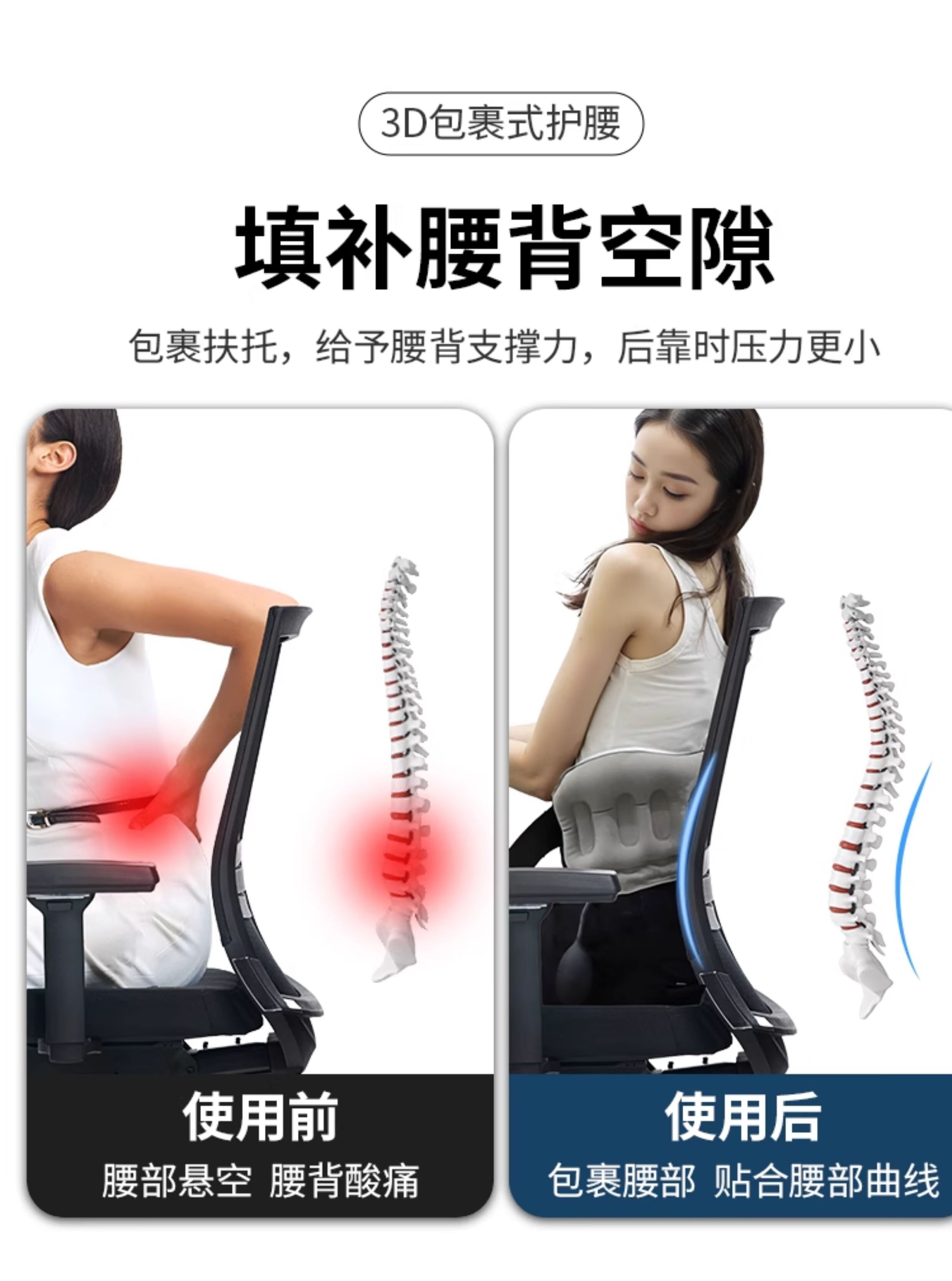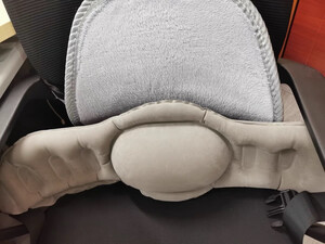刚拿到手就非常喜欢,整个造型都非常合理贴合,之前买的腰垫后腰多少都有点悬空。这次的有个垫子可以调节高度非常实用的,抵着腰很放松很舒服非常贴合。