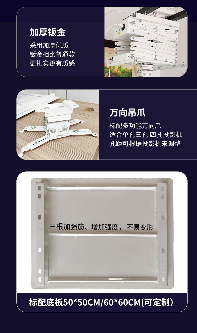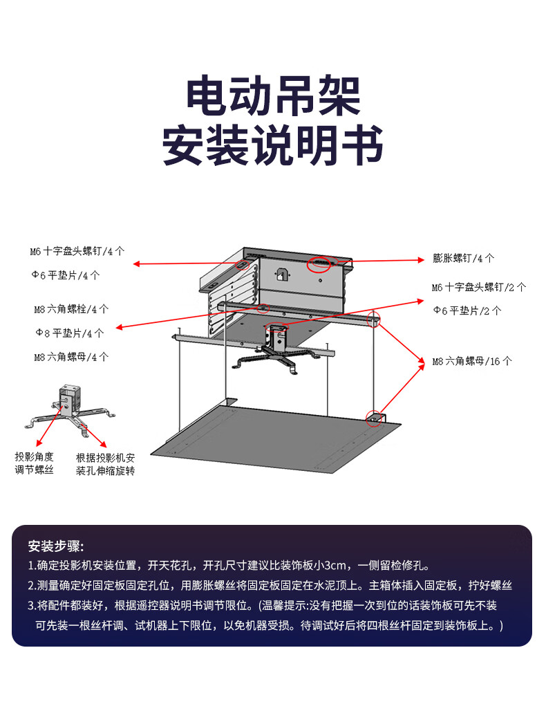 箱体、丝杆*4、底板、遥控器、投影机头爪、适配螺丝