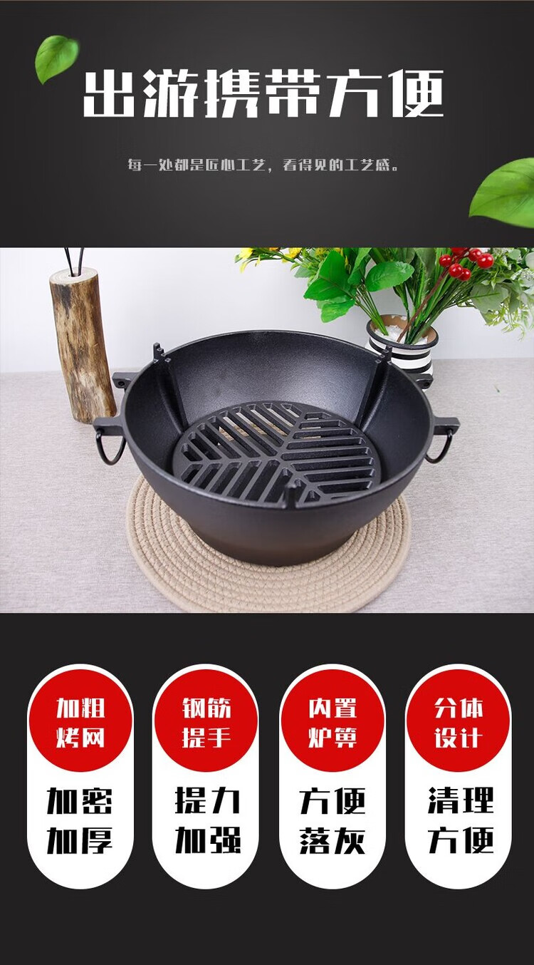 Nobana户外露营煮茶取暖炉铸铁碳炉野营家用木炭烧烤BBQ烤肉火锅碳烤炉 AHUI137 加大号28cm炉+木底座+圆形烤网30.5cm+烤