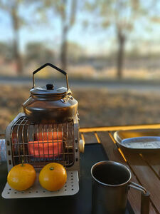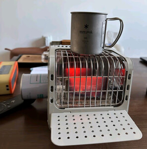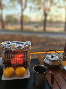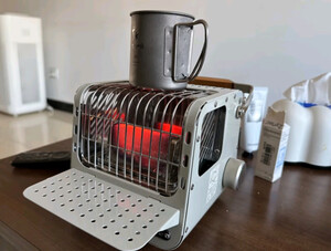 - 加热性能出色:该取暖炉加热迅速,采用1100w功率的蜂窝式发热网,能在短时间内产生热辐射,提供舒适温暖,取暖空间为5-10平米,一罐气可续航3-4小时,备两罐气基本能满足整晚露营需求. - 功能多样实用:不仅可取暖,还能烧水煮茶、温酒热茶,火力分散均匀适合焖饭,顶部相当于炉头,侧边有保温支架可放饮料,前面配有导热片给气罐保温,避免气罐在寒冷天气效率低下. - 轻巧便携:体积小巧,重量仅1.4kg,方便携带和储存,适合户外露营等活动. - 操作简便安全:使用平价卡式气罐,内部为磁吸接口,轻轻一推即可安装;旋钮操作简单,使用时注意周围不放易燃物、有人监管、气罐安装牢固等,在封闭空间使用需开窗通风,安全有保障. - 外观设计美观:砂岩色外观颜值高,搭配户外露营场景十分合适,且配有单独收纳包,方便收纳携带.