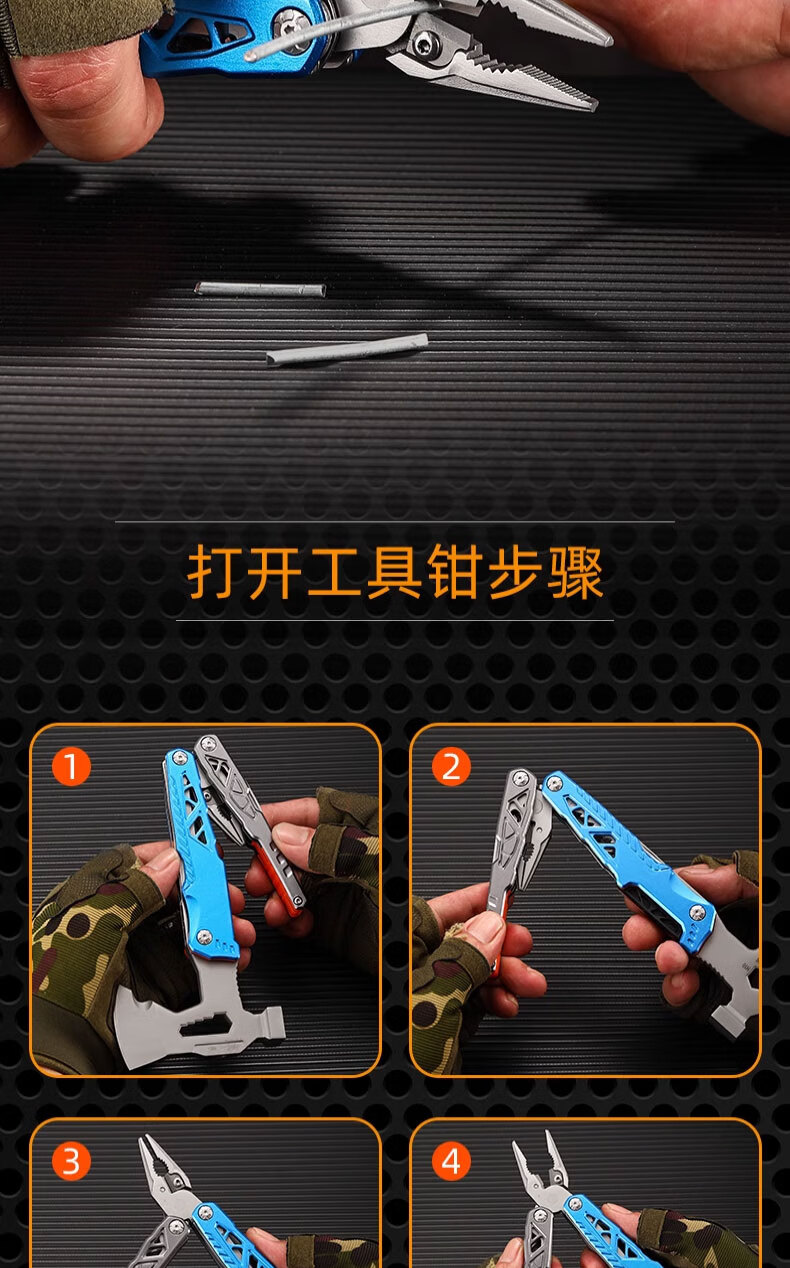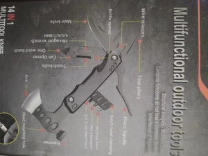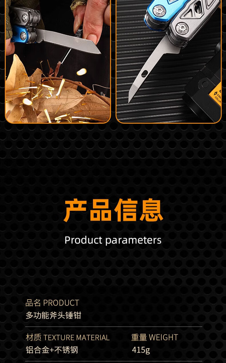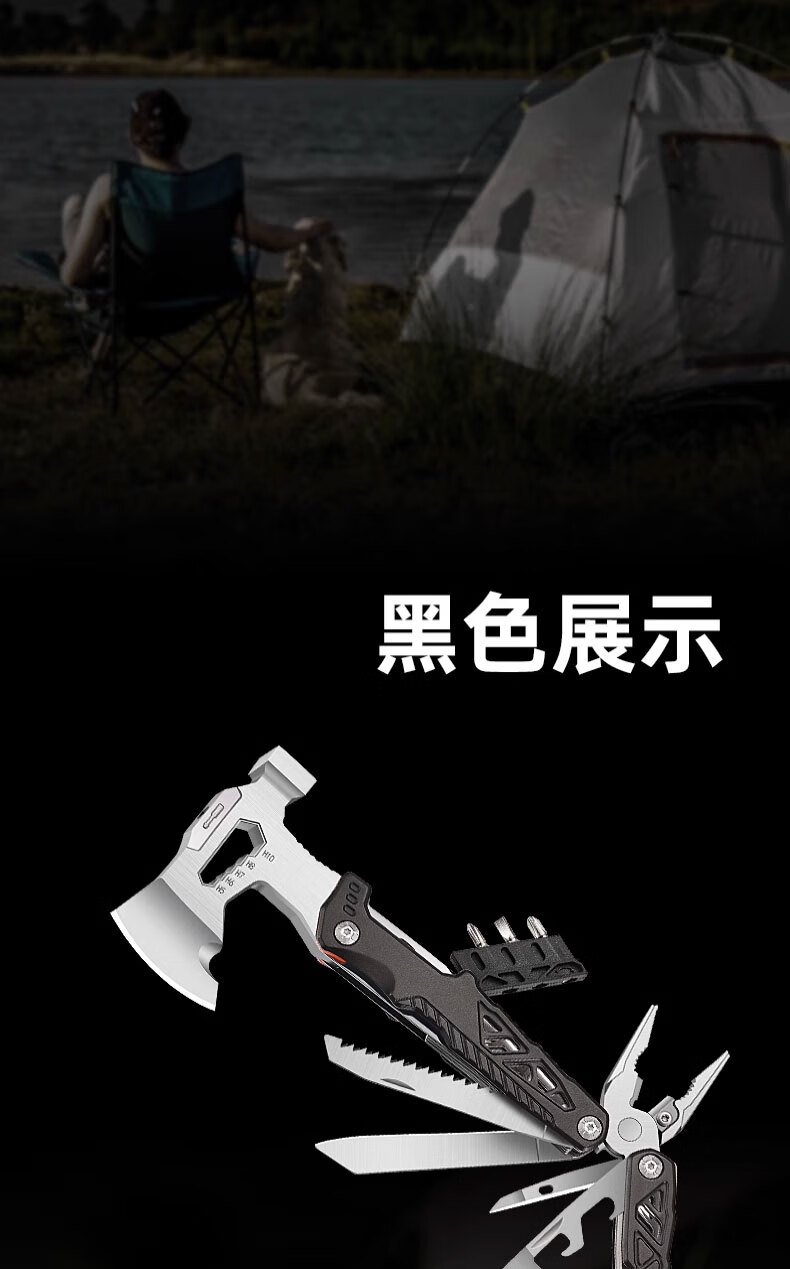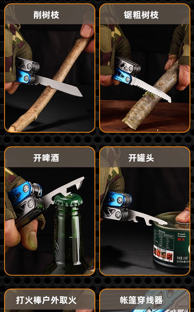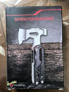 包装精美,功能超级多,用料足,钳子有劲,斧刃刀子锋利,还有口哨打火棒,这设计很完美,大小合适携带方便,户外露营防身必备神器