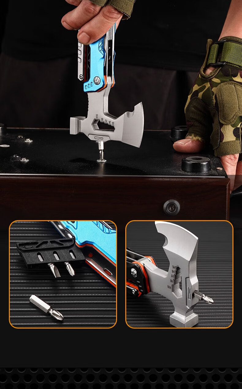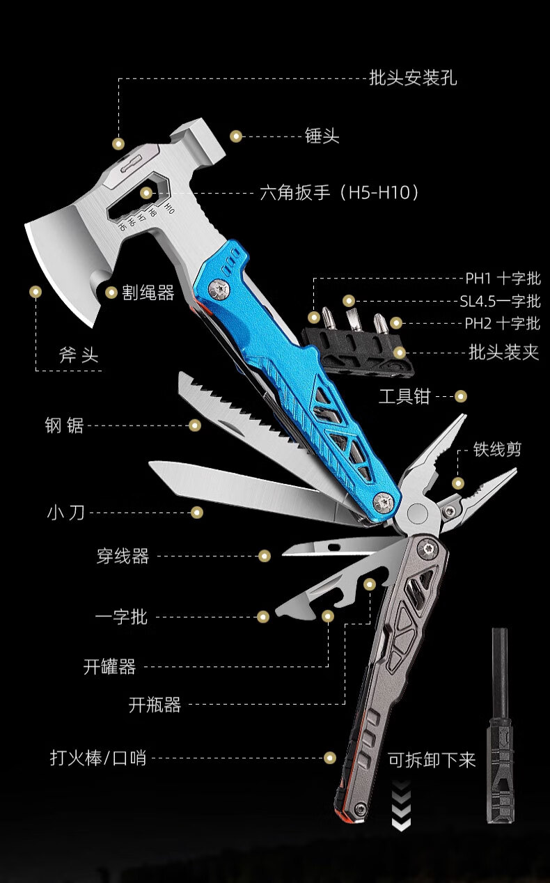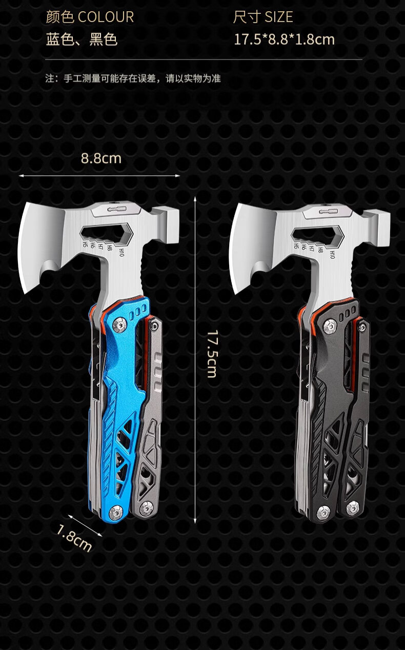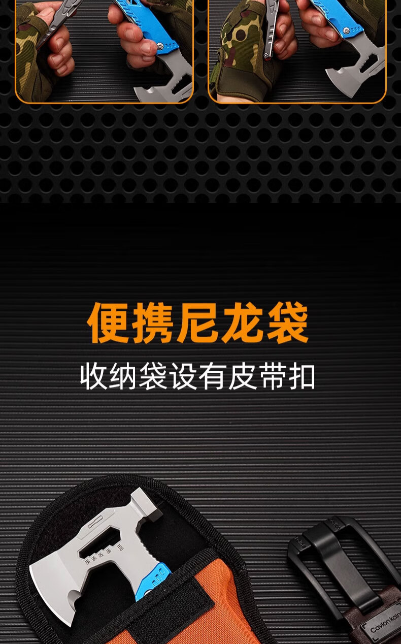 非常好用的小工具,有收纳袋携带非常方便,工能超级多,户外应急好帮手,功能多很实用,斧头硬度高很坚硬锋利,功能齐全