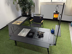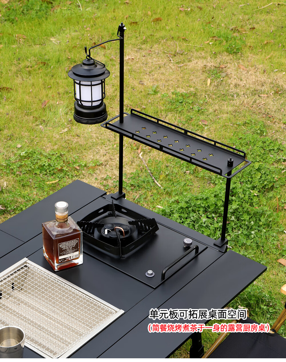 这张桌子很漂亮,也很长,黑色我很喜欢,除了露营很应景,5个单元格可以有很多种搭配方式,我先配了炉头茶盘和置物架,其他的会慢慢搭配,桌子做工感觉也还行,感觉拍照很出片