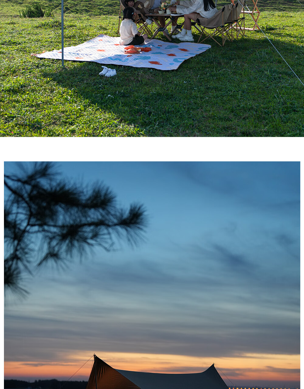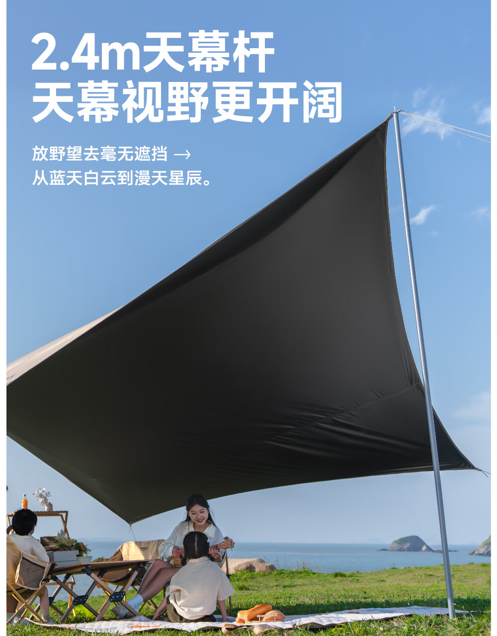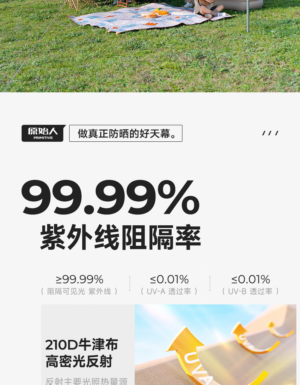 天幕质量非常好,搭起来颜值非常出镜,天幕下很凉快,钛黑胶的,有黑胶的凉快和银胶的明亮,非常的不错,原始人好牌子,质量非常好