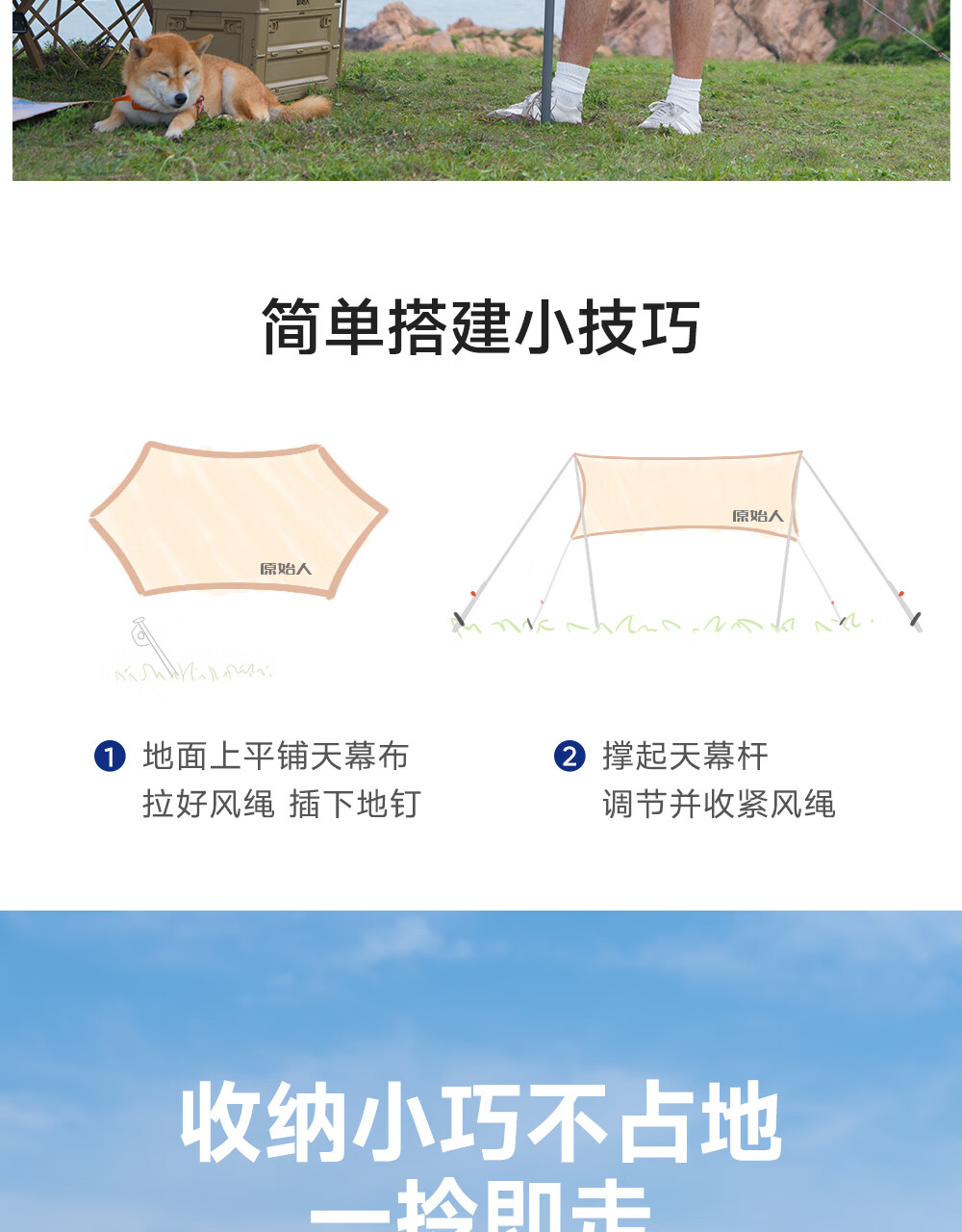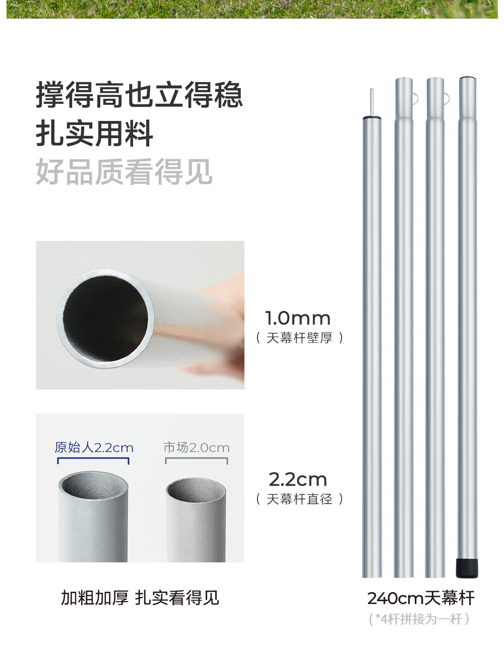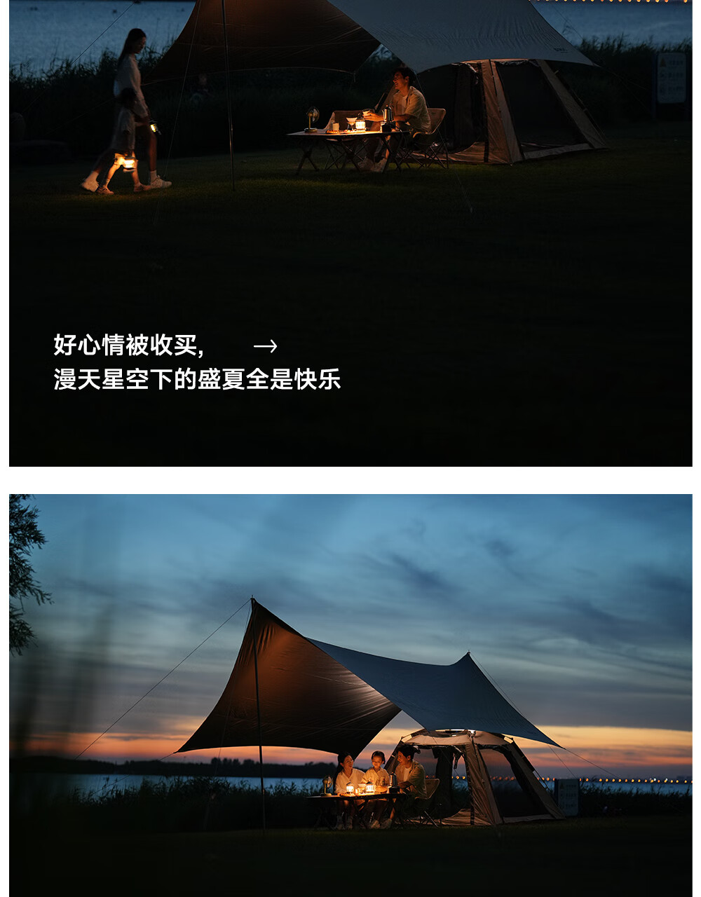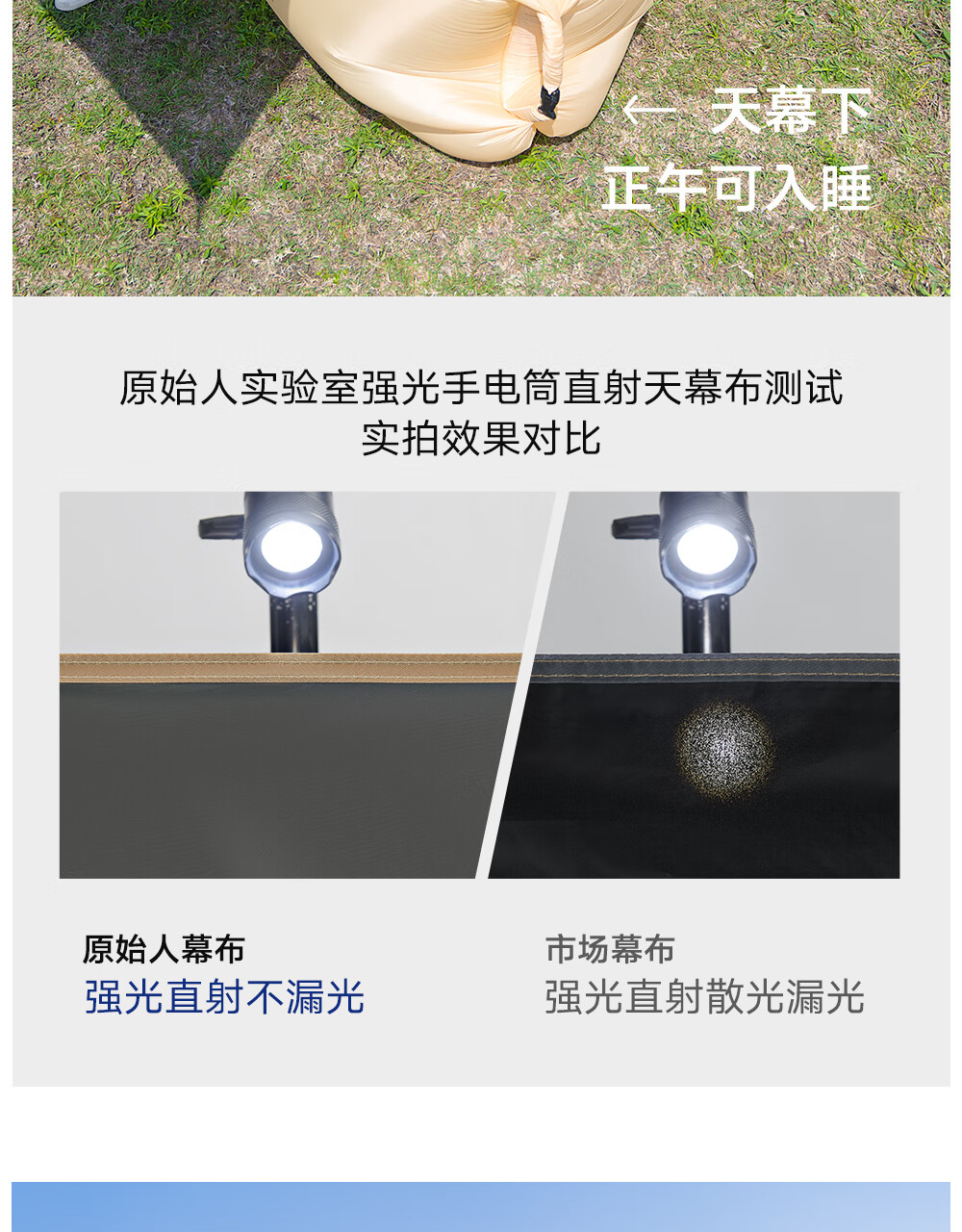 天幕质量非常好,搭起来颜值非常出镜,天幕下很凉快,钛黑胶的,有黑胶的凉快和银胶的明亮,非常的不错,原始人好牌子,质量非常好