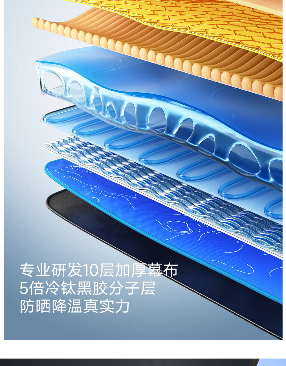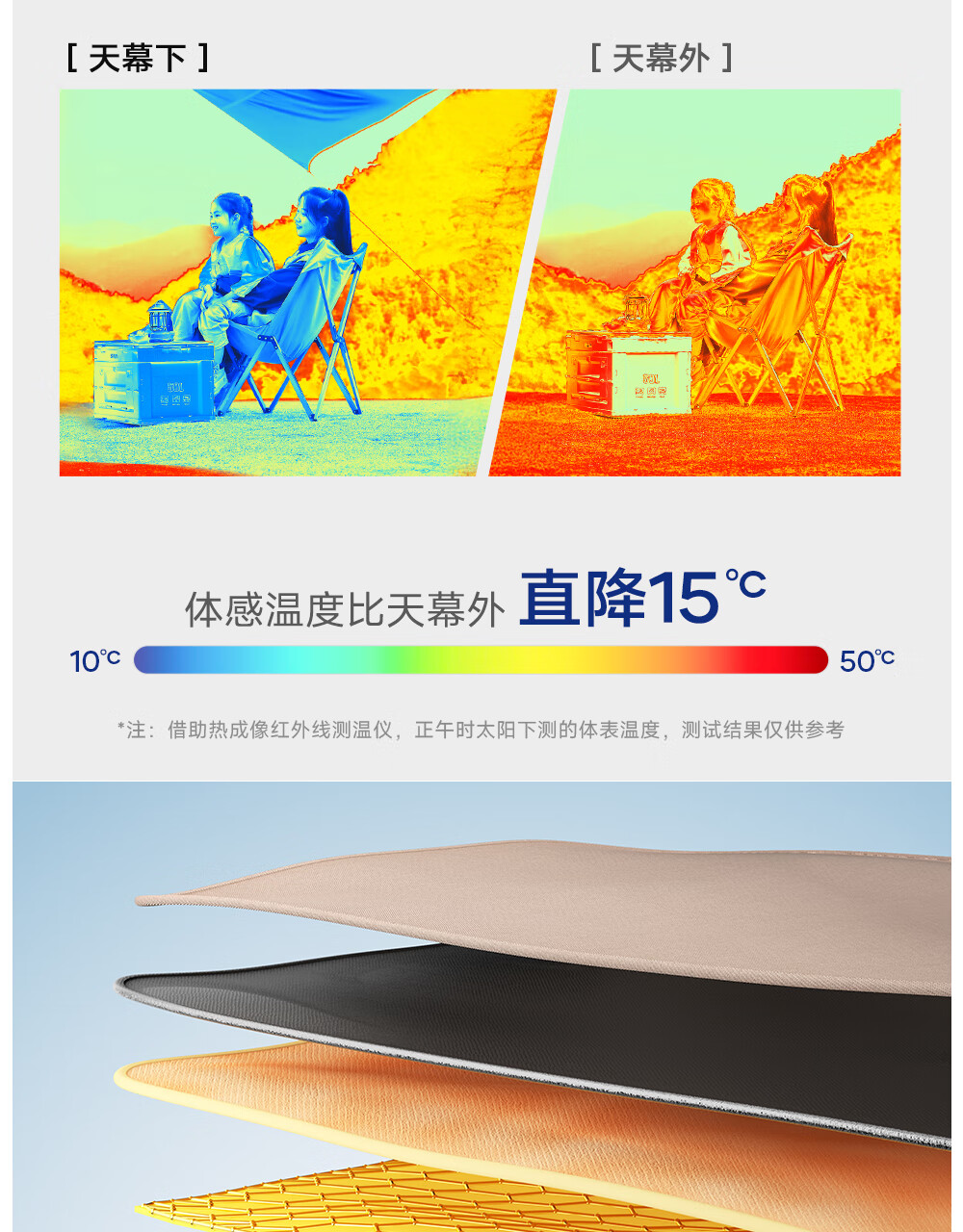 防晒效果不错,今年的国庆节天气太热了,35°左右,但是天幕下面还是比较凉快的。安装方便,很好搭,布料厚实完美,幸好有天幕,不然要热疯!