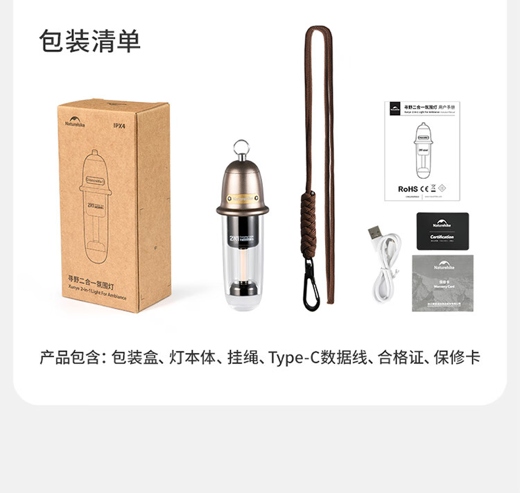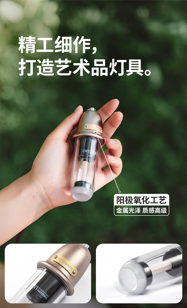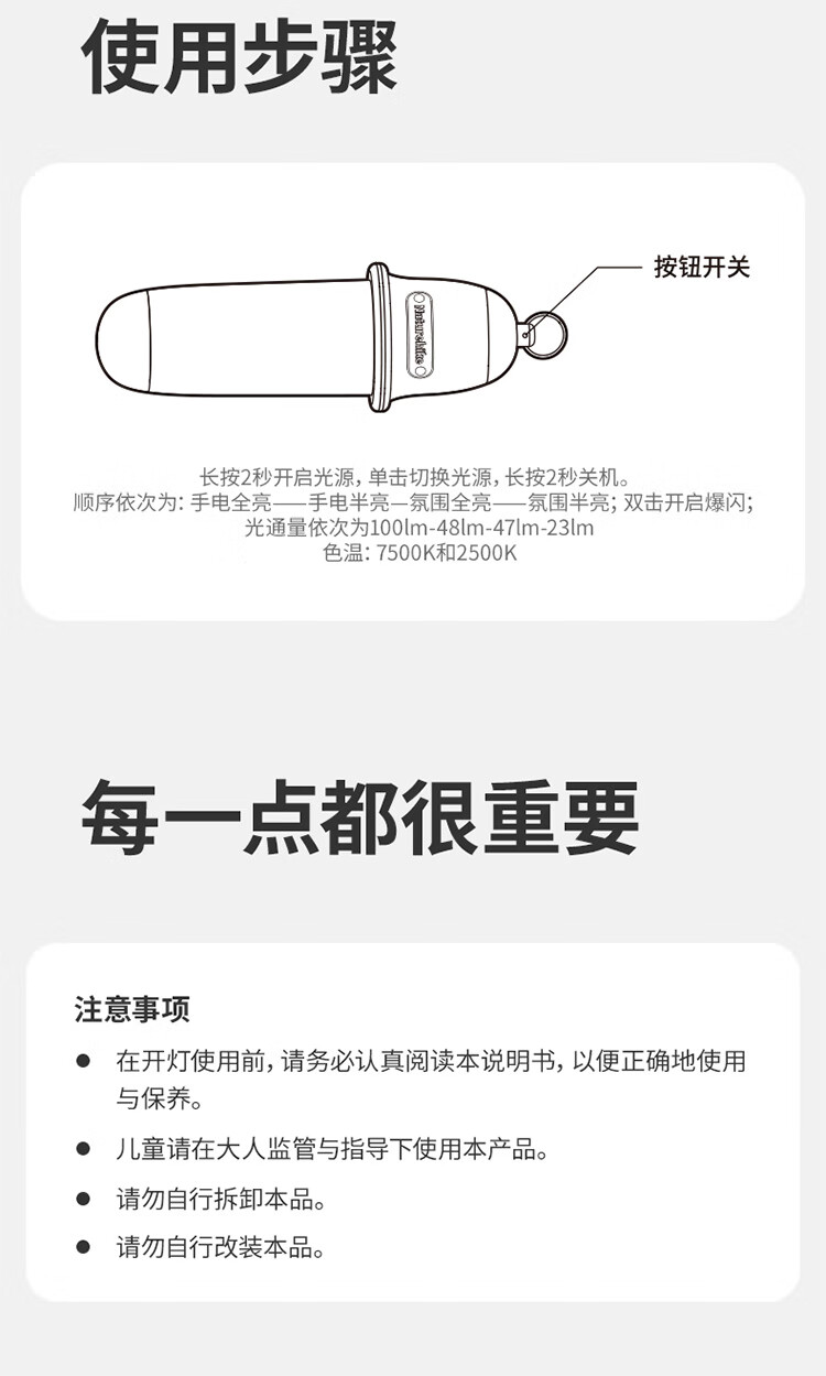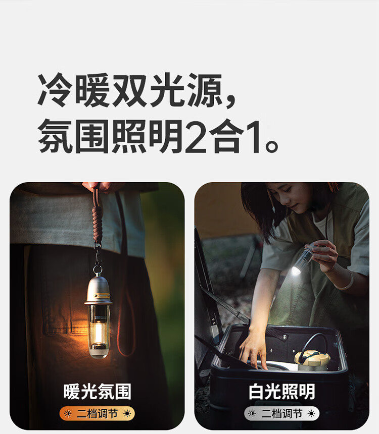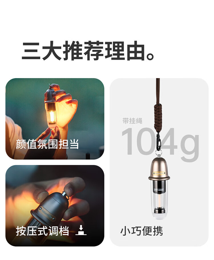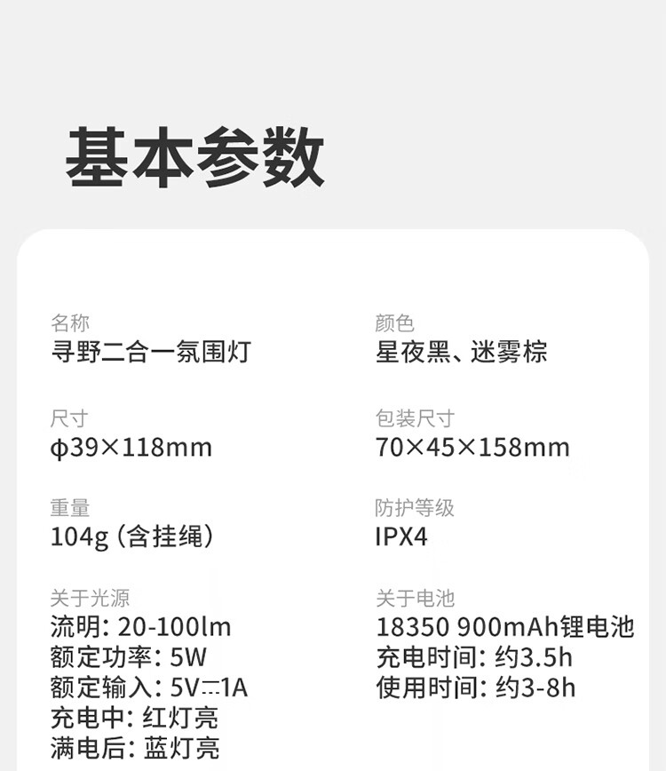 产品材质:还可以 做工比较好 紧实 没有那种廉价的粗糙干非常不错的露营灯 光照强度:不错很够用 产品重量:轻便 外出拍照无压力 电源类型:充好电很方便 其他特色:配的挂绳好评好实用