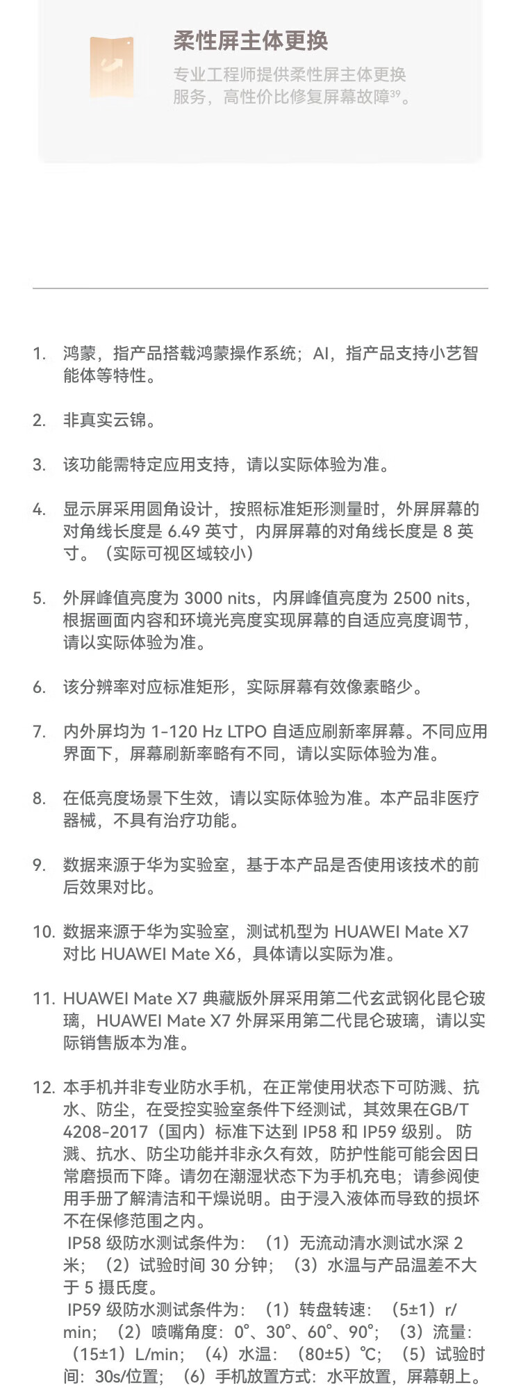 AI大模型,折叠屏,卫星通话,轻薄,LTPO屏幕,高频PWM调光,全焦段影像,潜望式长焦,防水防尘,无线充电,NFC,红外遥控,大底主摄,等深微曲屏