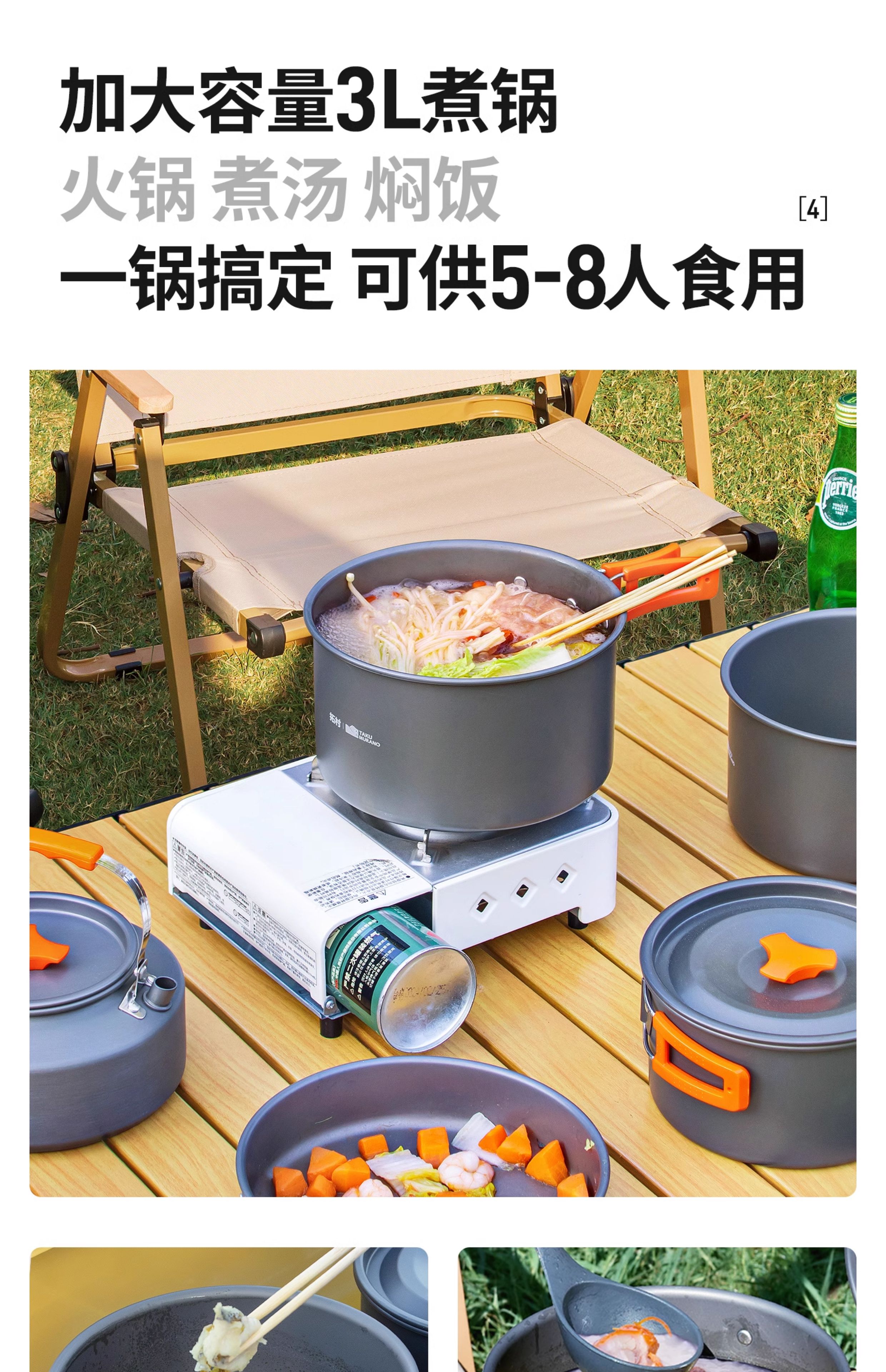 漂亮!高山炉和锅具一起买的,四件套基本齐全了,烧水煮茶,煎锅各种煎炸,煮锅有大有小,按需选择哪个,关键能全部装在一起,方便携带