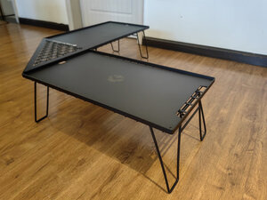买的是两桌一板,桌子是钢制的,表面有黑色镀层,用材和焊接都很扎实,每个桌子两个桌腿,打开时是嵌入卡扣固定的,需要把桌腿的内环手动拉开,卡入两个卡扣中,固定好后,桌子很稳,基本的承重肯定是没问题的,两层桌子搭在一起也很稳,正常承重不用担心结构强度不够,收纳起来,桌子收腿后叠起来,放在包里,厚度也不厚,想要购买的朋友,先了解一下它的尺寸和重量,我个人觉得长宽尺寸和重量对于我有点大,适应一段时间应该就没问题了,其他的都没问题。