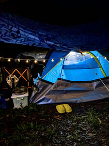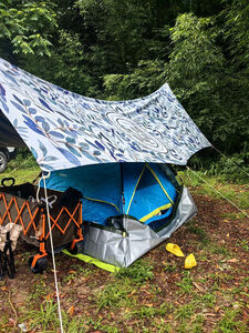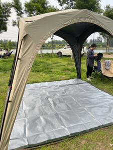 这个防潮垫厚度还是可以的,防潮效果也比较好,晚上收的时候,接触地面的一面,能明显看到蒸馏水,那是地下的水汽凝结出来的。这个也可以一物多用,下雨天搭个雨棚,大风天围个挡风围布都可以,就是只有四个孔,再多一些就更好了,还有最大的尺寸只有3-3米的要是再多点尺寸就行了。