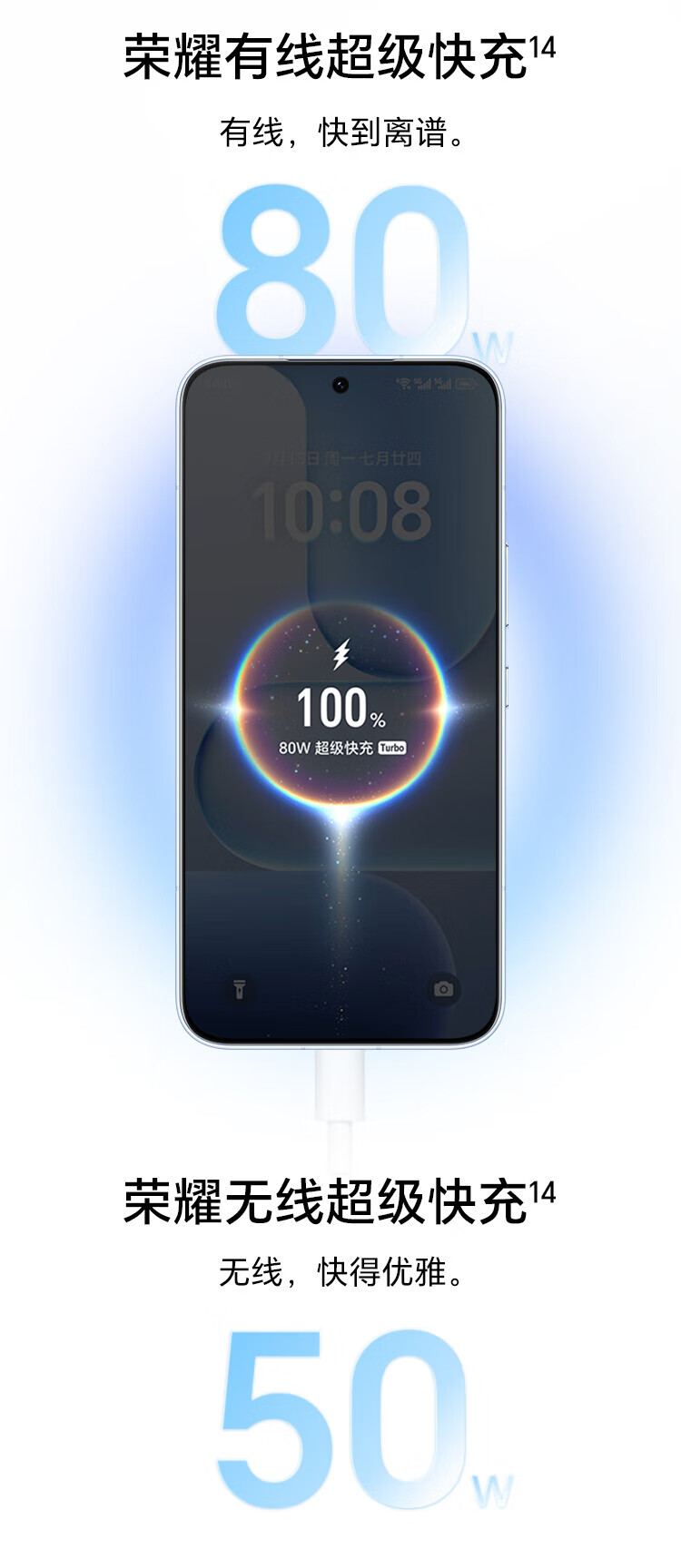 外包装采用塑封,彩盒内标配: ①手机(含内置电池)x1、②快速指南(含新机权益卡和电子三包凭证)x1、③HONOR SuperCharge充电器x1、④USB Type-C 数据线x1、⑤取卡针x1、