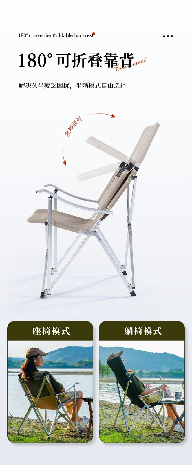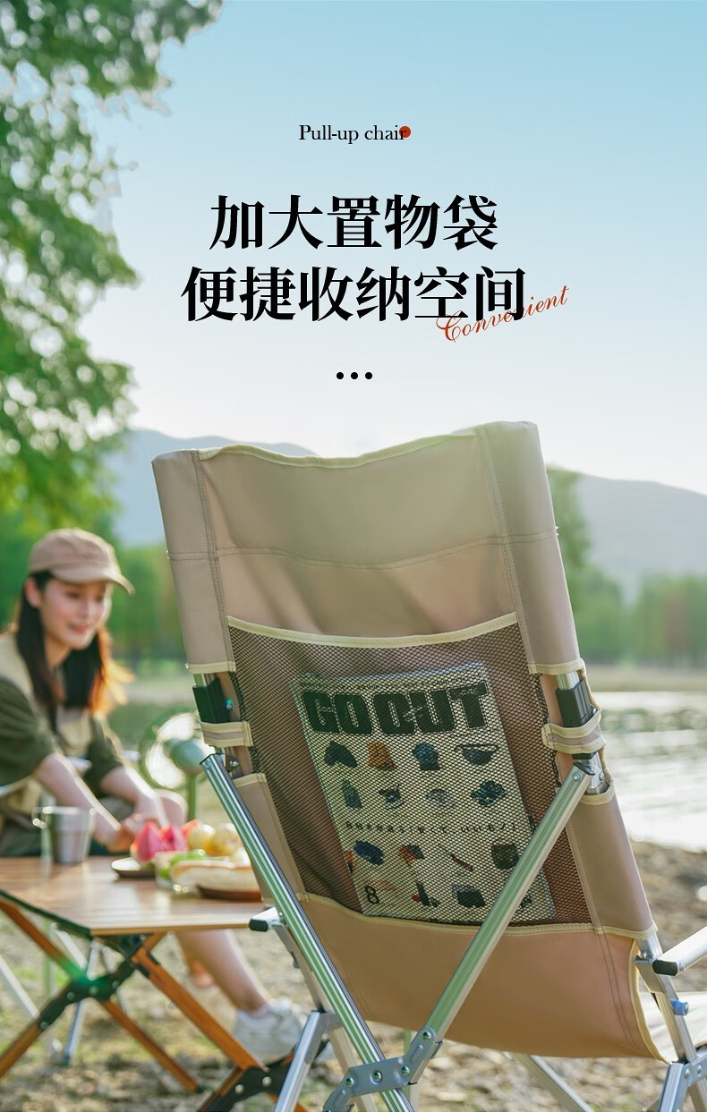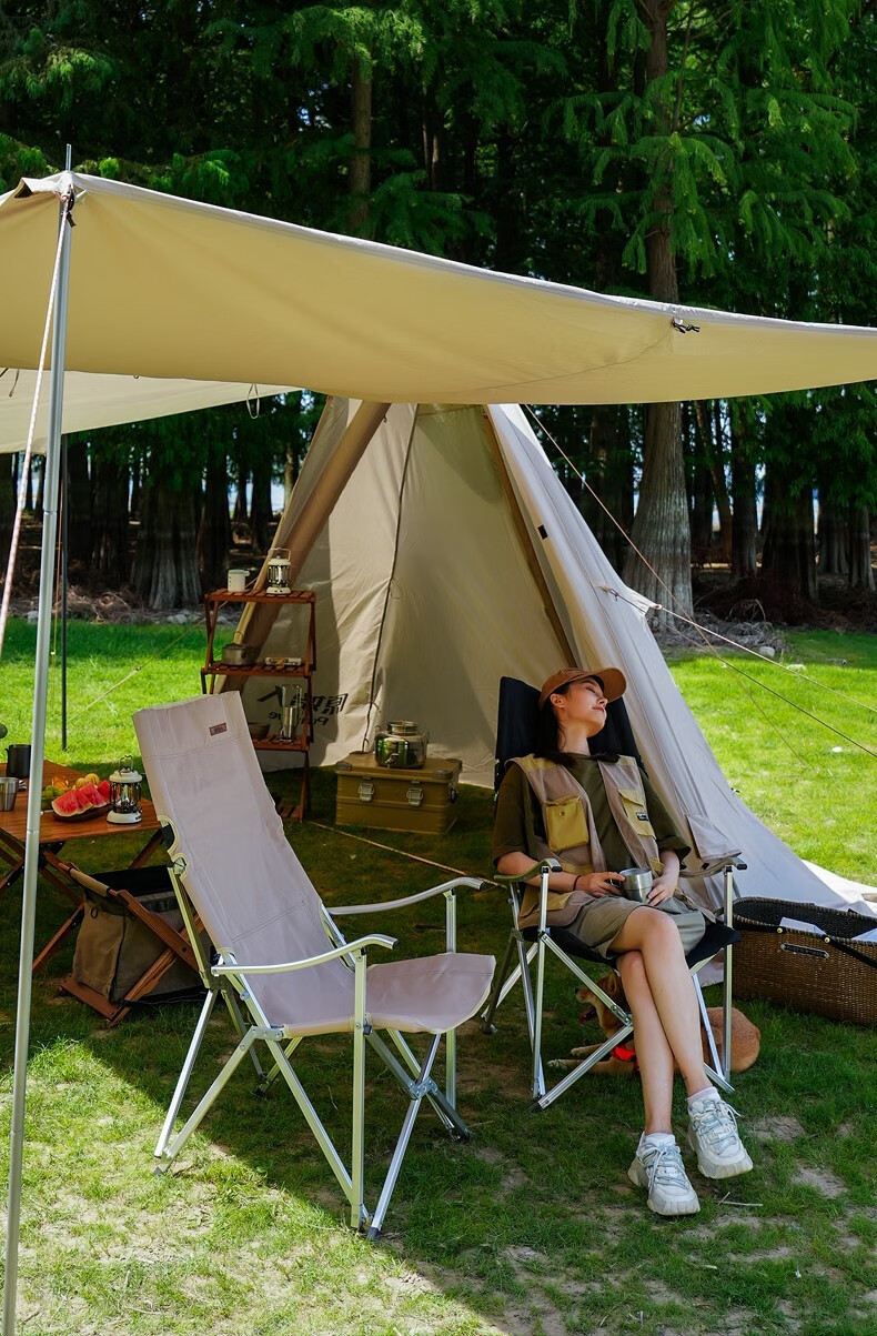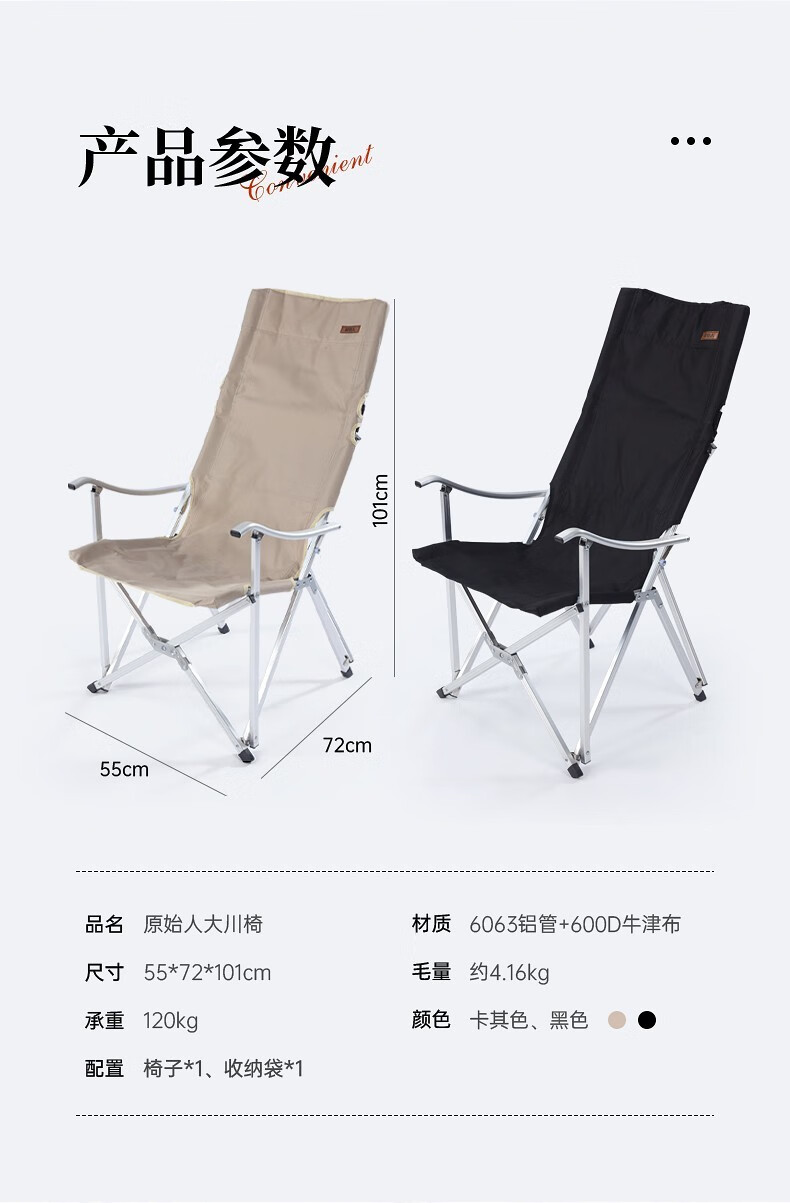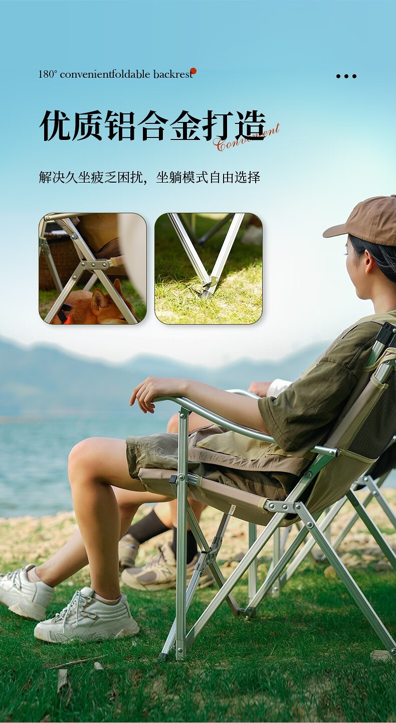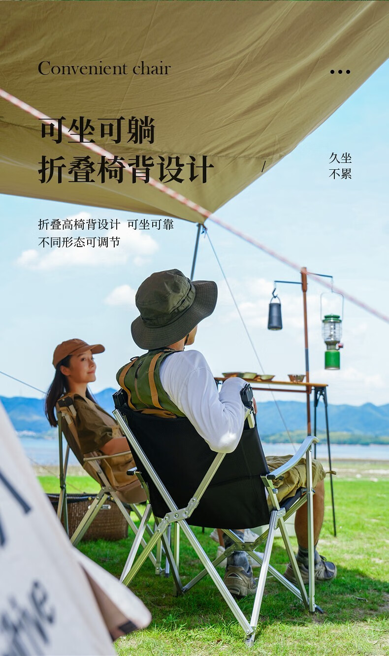 不错的露营椅子,亮点是椅背可以折叠,收纳长度93厘米,近似长方体装车省地方。做工扎实椅背折着坐着舒服展开可以向后半躺小憩角度也很舒适。椅子整体的设计即使小孩子跪在椅子上趴在折起的椅背上椅子也不容易向后翻倒。整体用料不错,铆钉等做工细致。铝合金料材附膜保护,这点很赞,虽说得自己撕下来但厂家这点很讲究。