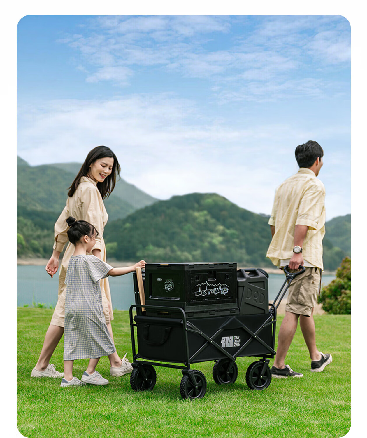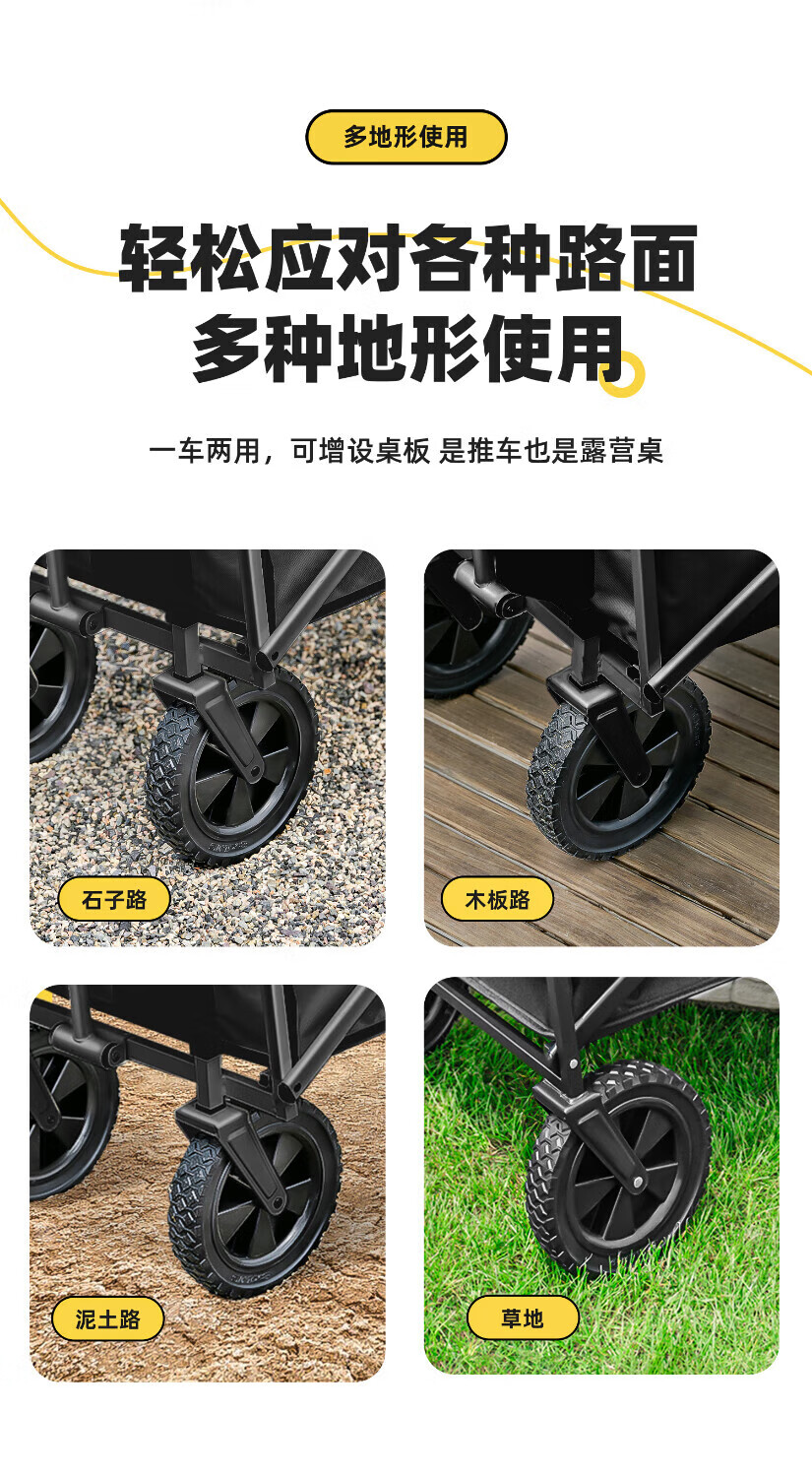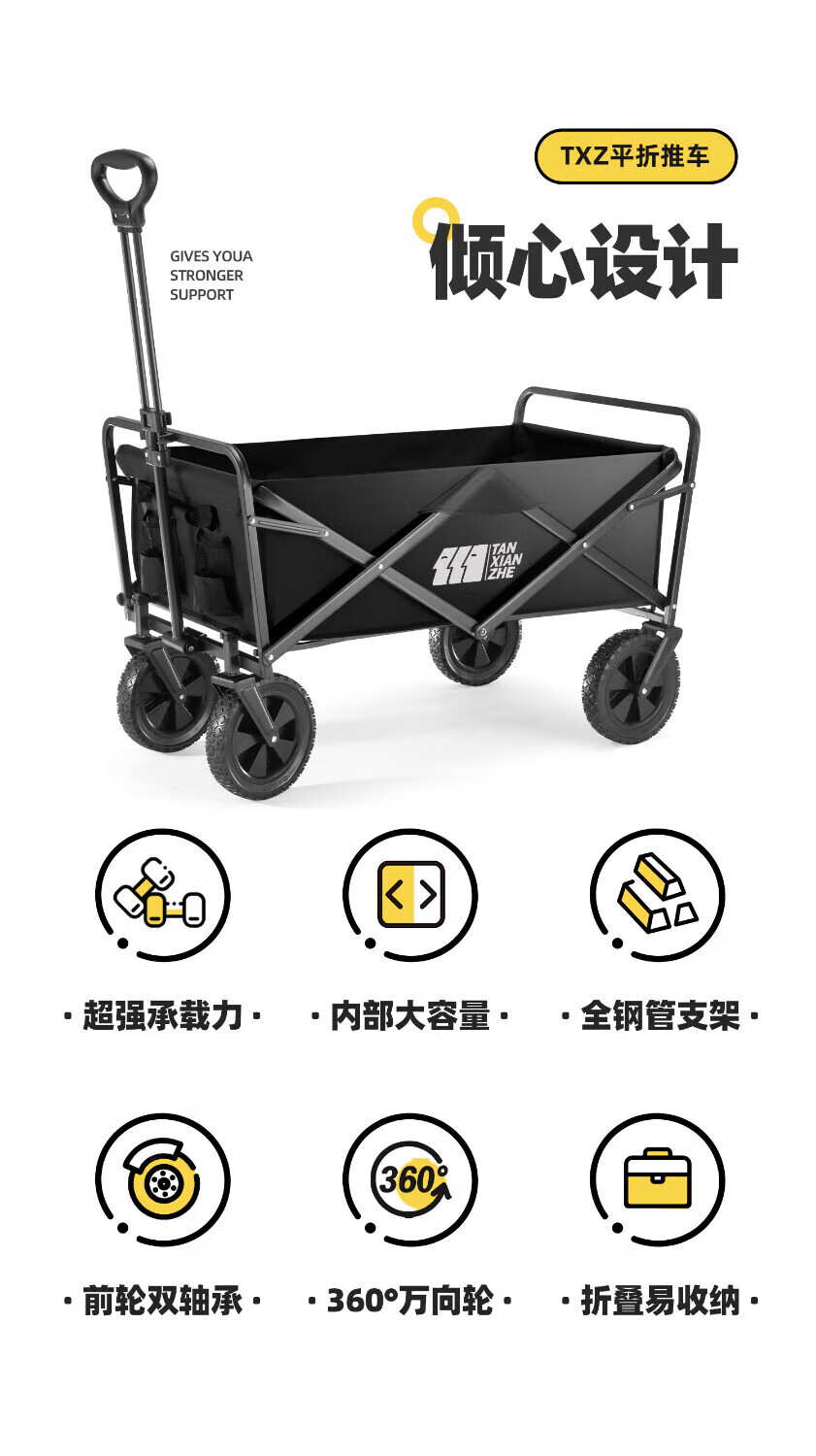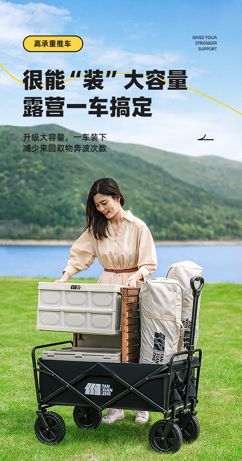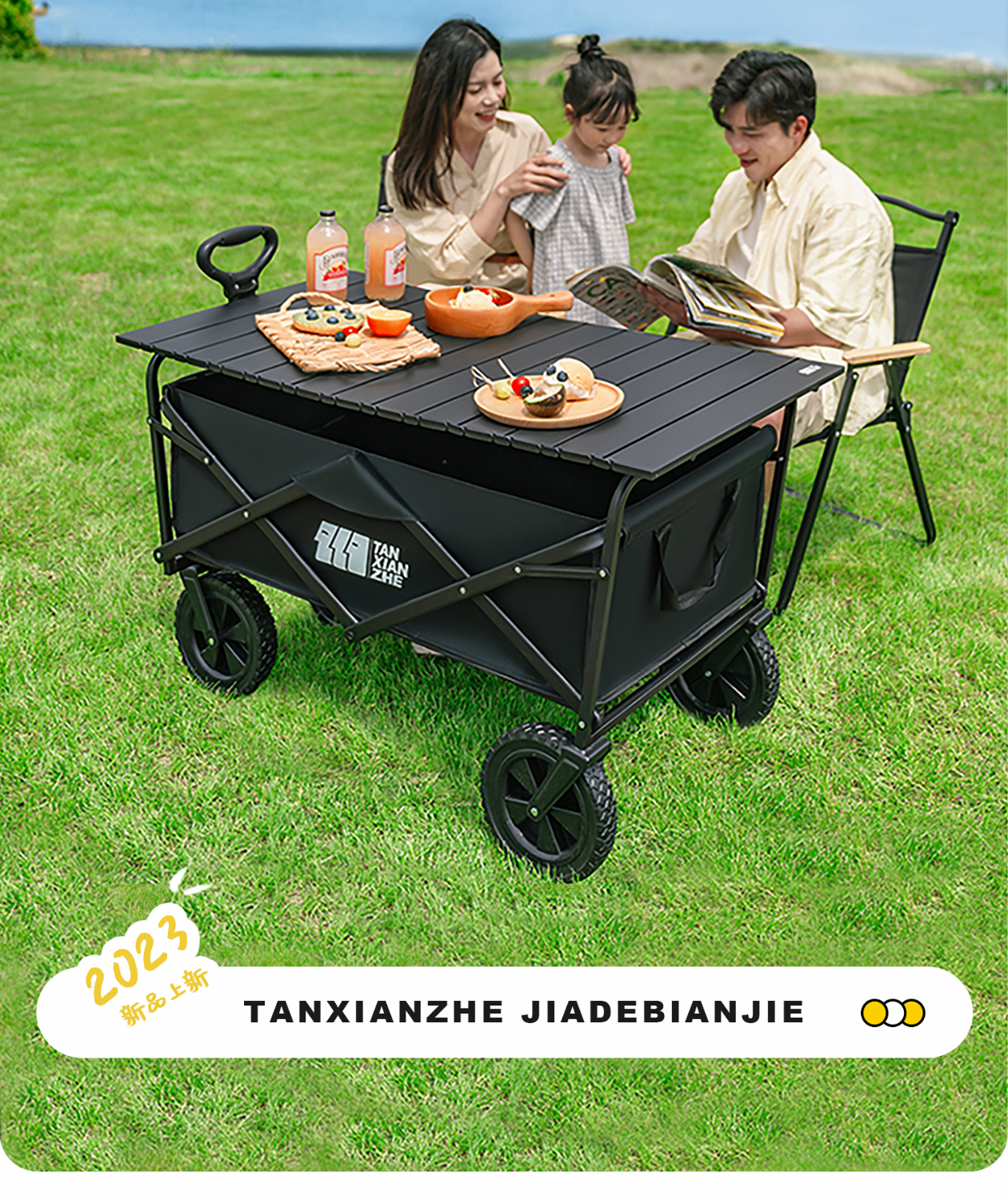 探险者露营车户外折叠推车营地车快递摆摊野餐车大容量野营拖车 黑色便携款【万向静音轮+桌板】