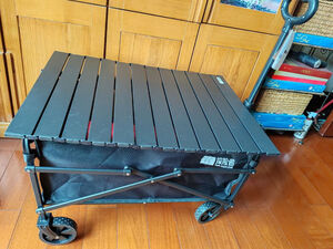 第1次买这个便携式小车,感觉挺实用,装东西不少,折叠起来不占空间,美关易收纳,价格也适中,上面还带一个桌板,便于野外用餐,喝茶。