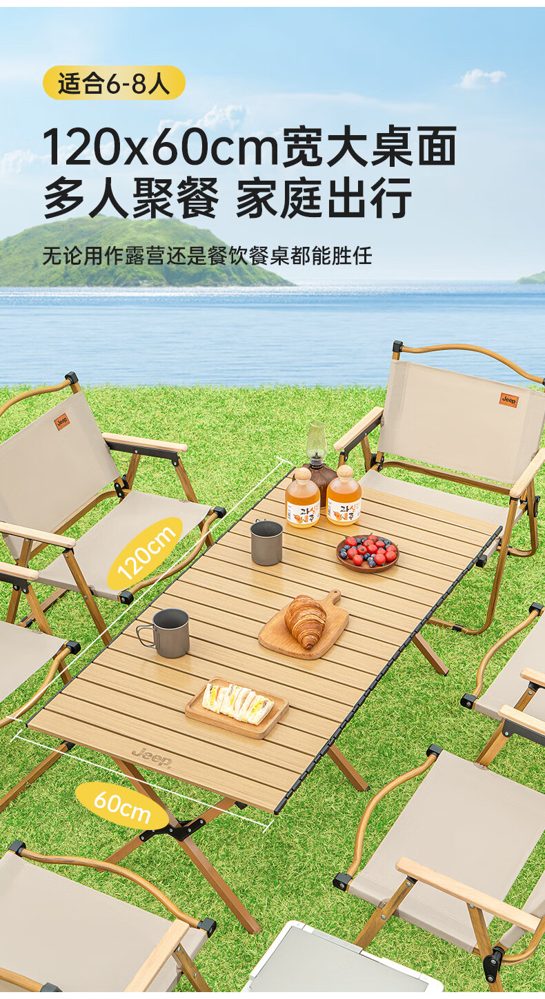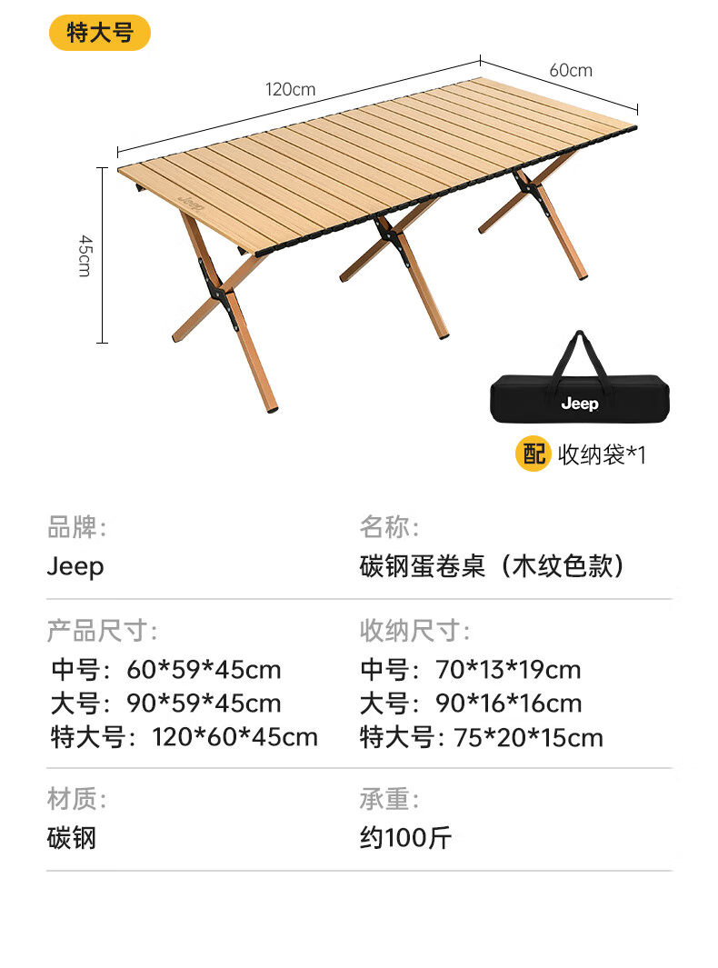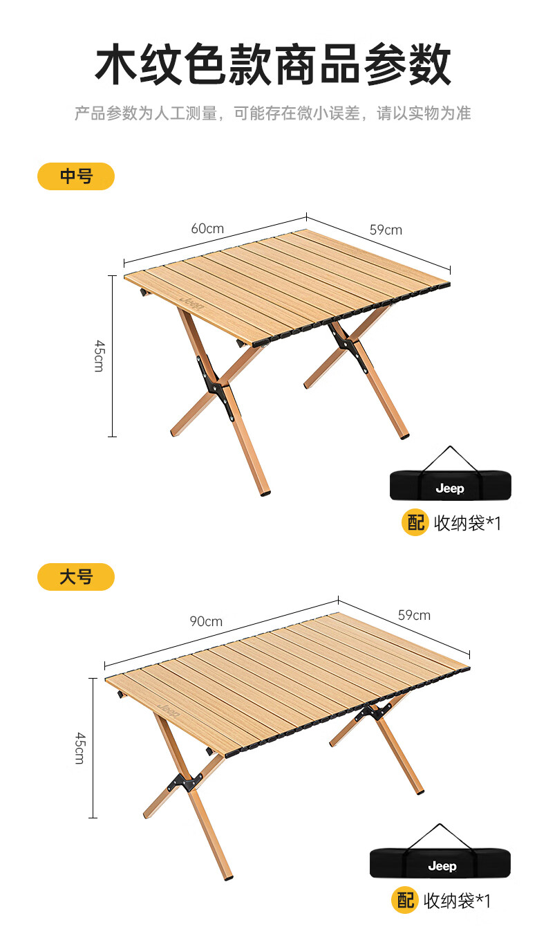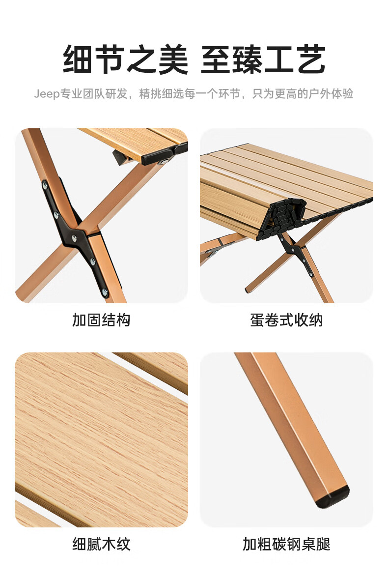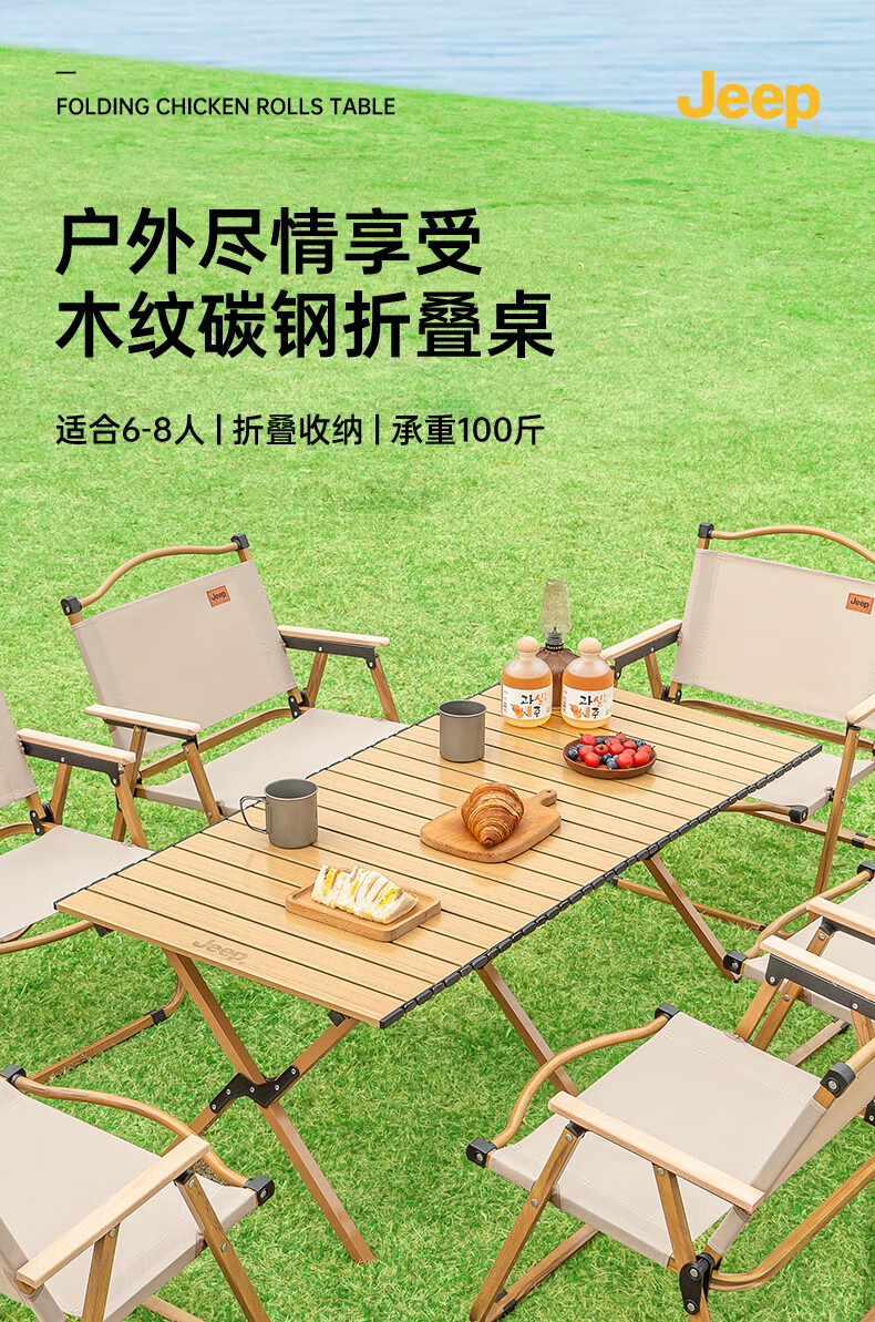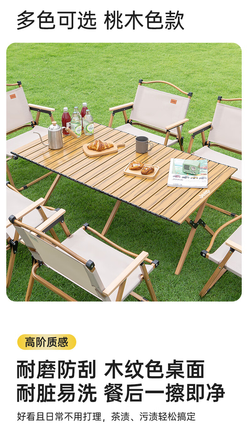 JEEP 户外折叠桌松木蛋卷桌露营桌子野餐桌椅便携式装备野炊桃木桌子 木纹色中号【赠收纳袋】