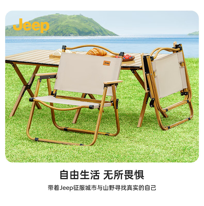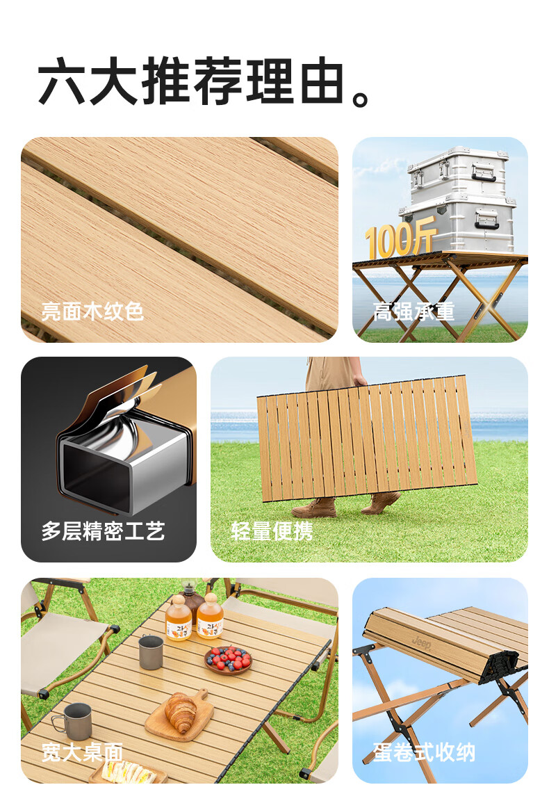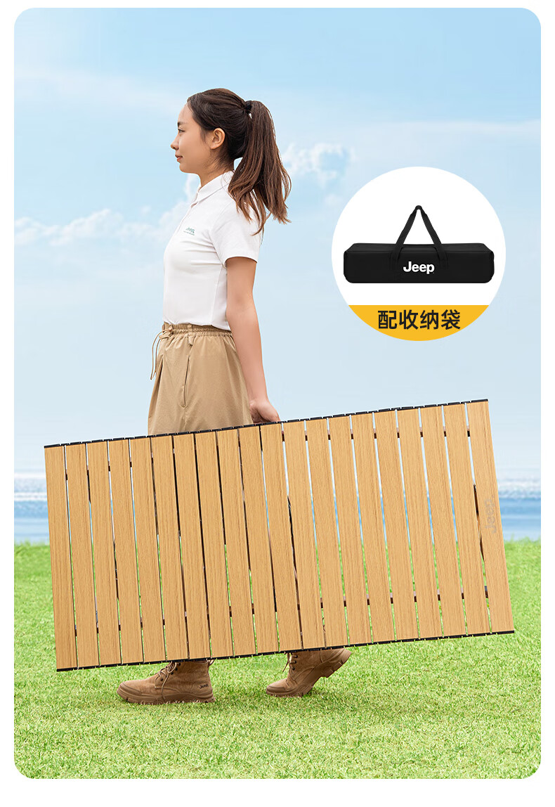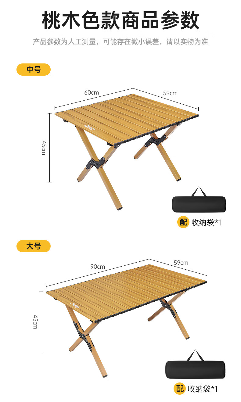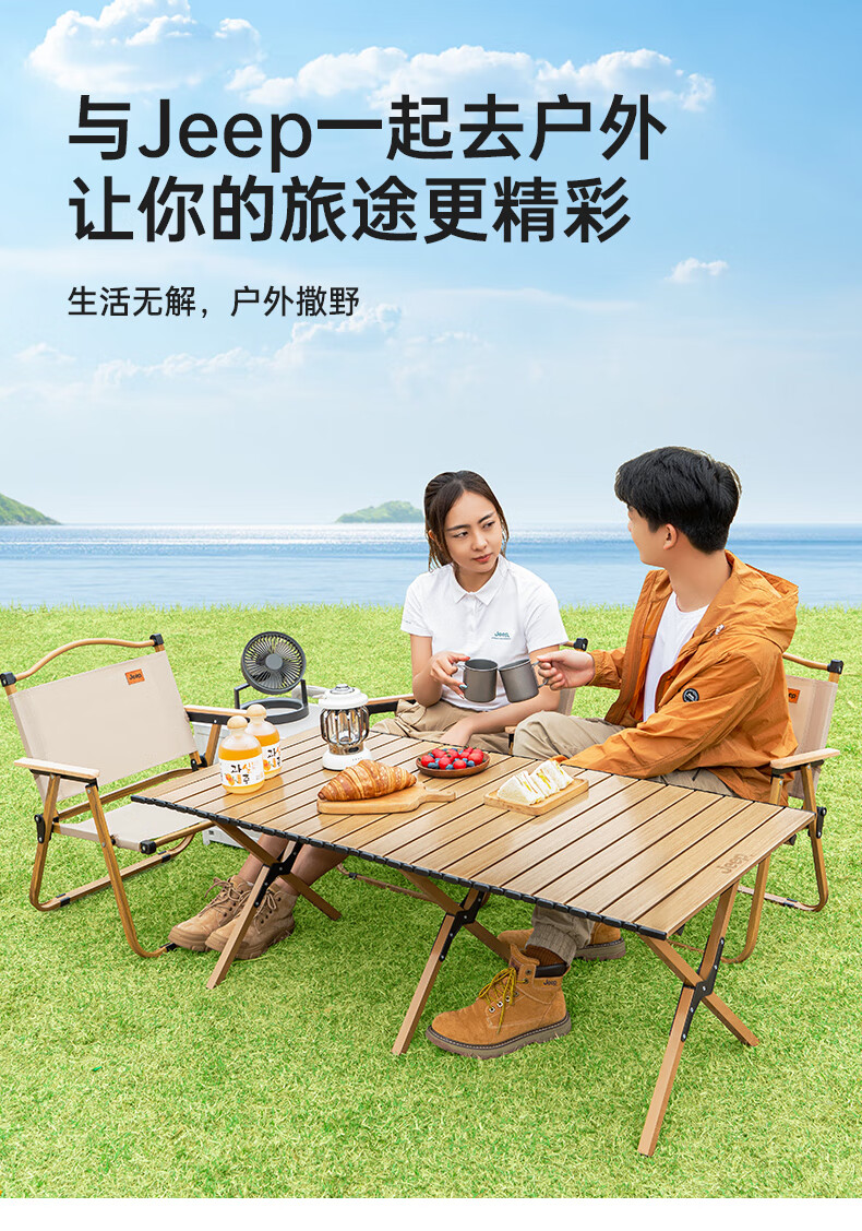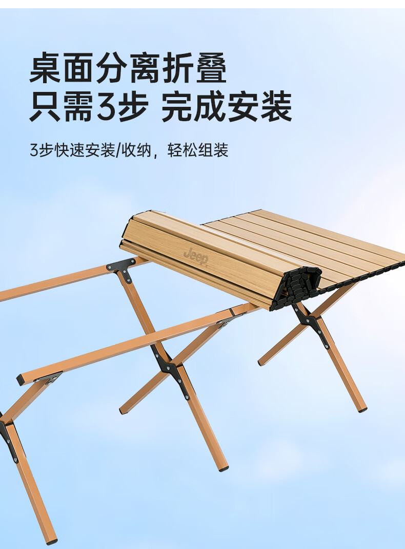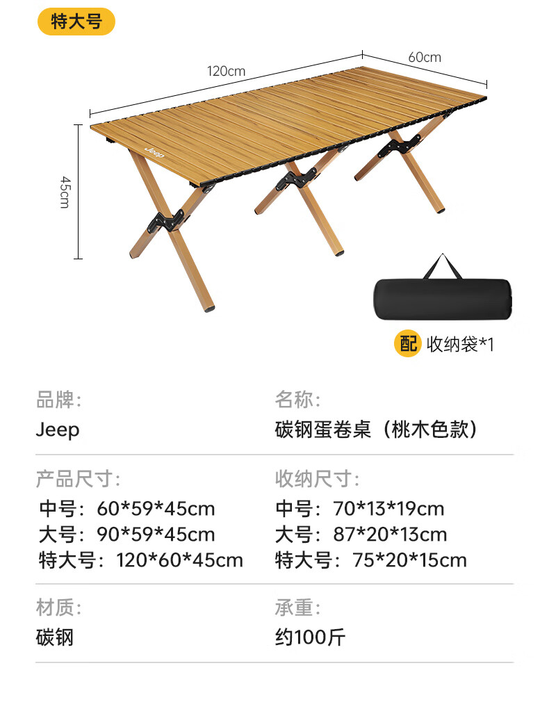 JEEP 户外折叠桌松木蛋卷桌露营桌子野餐桌椅便携式装备野炊桃木桌子 木纹色中号【赠收纳袋】