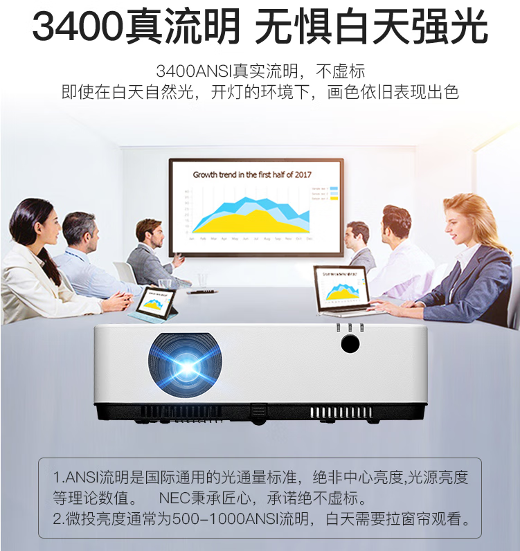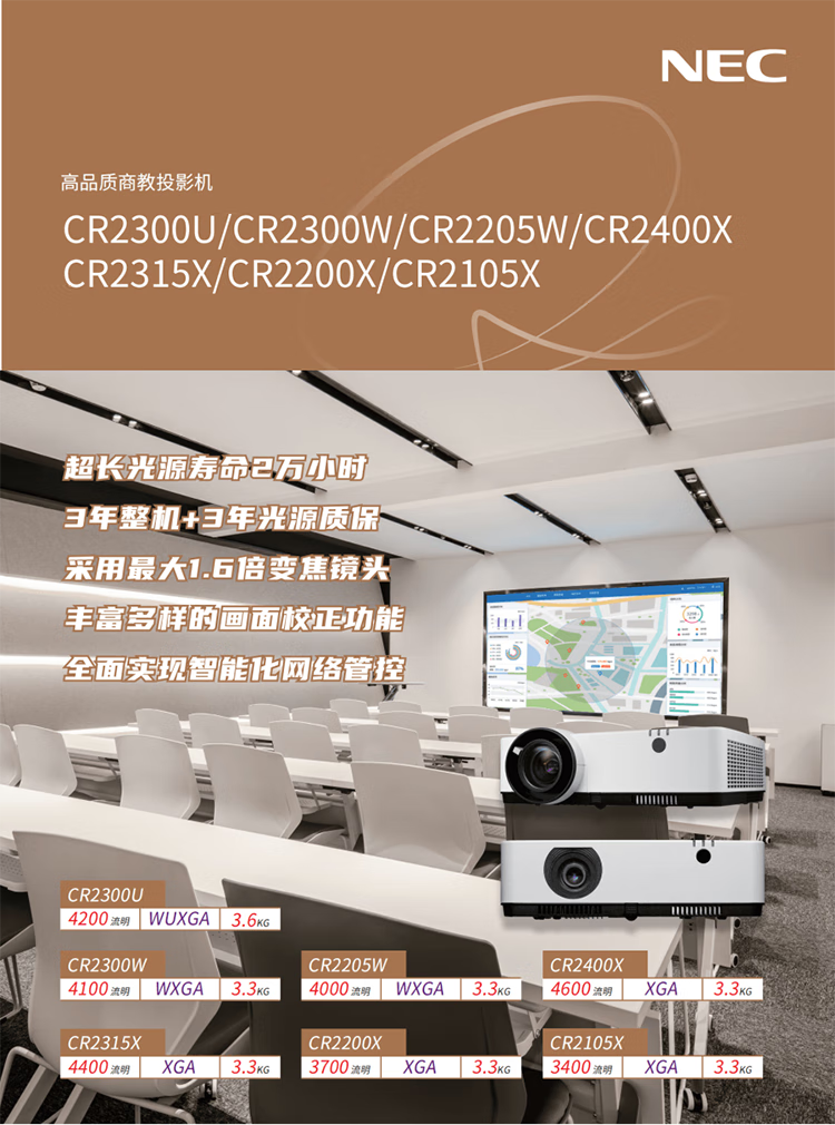 NEC投影机 投影仪 商务办公会议 教学培训便捷 高清高亮度1.6倍变焦镜头 3LCD技术投影仪 CR2300U 4200流 标配+120英寸电动幕+免费安装