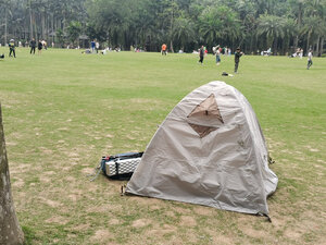 帐篷被折叠起来放在背后了,重量适中,感觉除了野外徒步,想平时的露营和公园活动也可以带上派上用场,两个人待着也不挤,打牌也适合