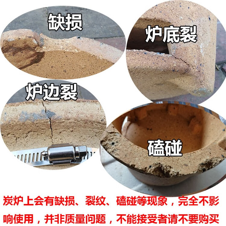 炭炉与瓦片都是比较粗糙的,边边角角会有毛刺,炭炉在窑里烧制时,出窑时,运输时都会出现小磕小碰,缺角,小裂纹等现象,都是正常的现象,并不是质量问题,对此不能接受的或者要求很光滑的朋友,请不要购买。
