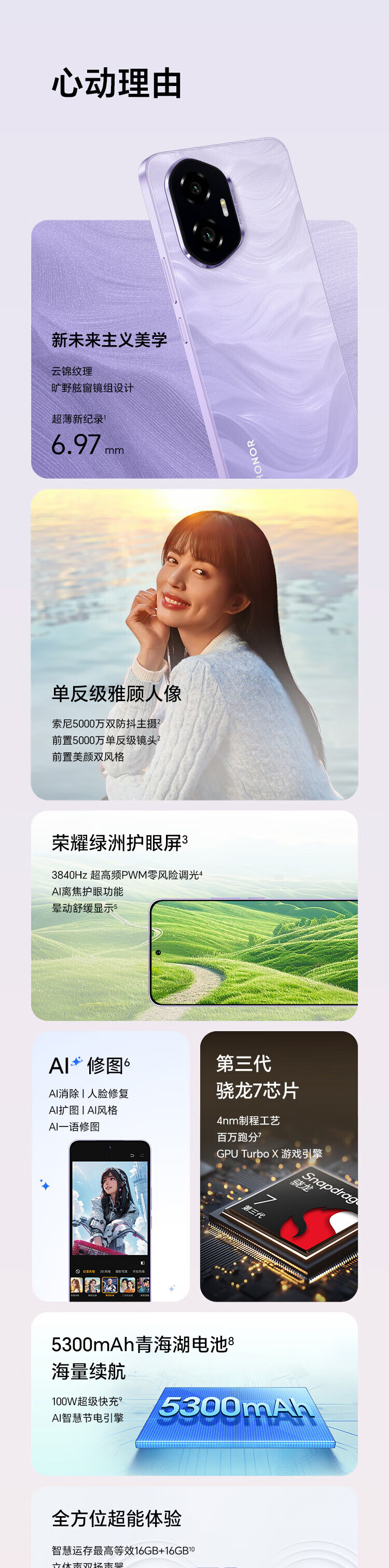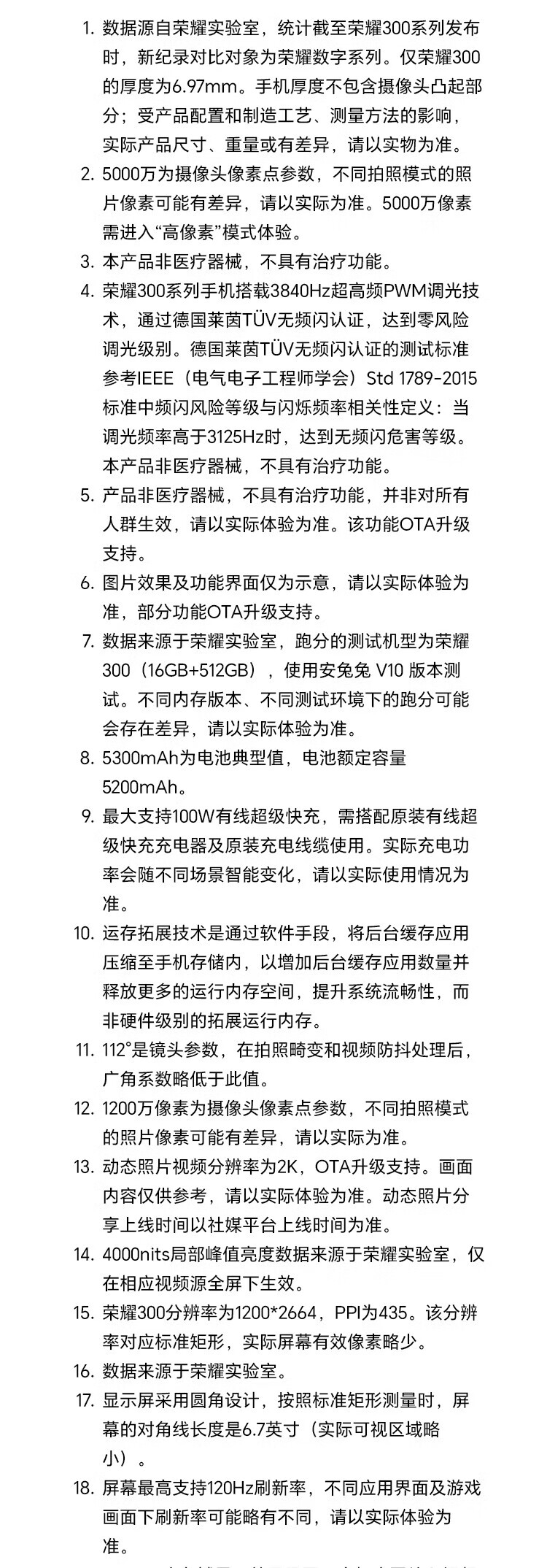 荣耀(HONOR)Honor/ 荣耀3005G小直屏 单反级雅顾人像 荣耀绿洲护眼屏 荣耀300【玉龙雪】+快充配件 12GB+256GB x x通5G