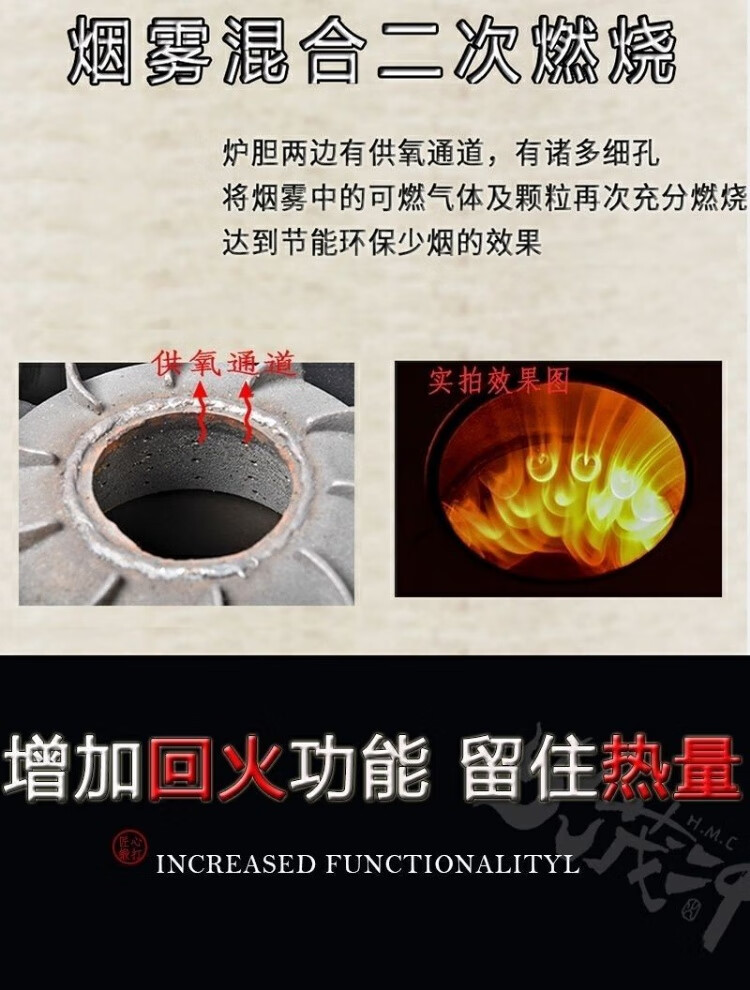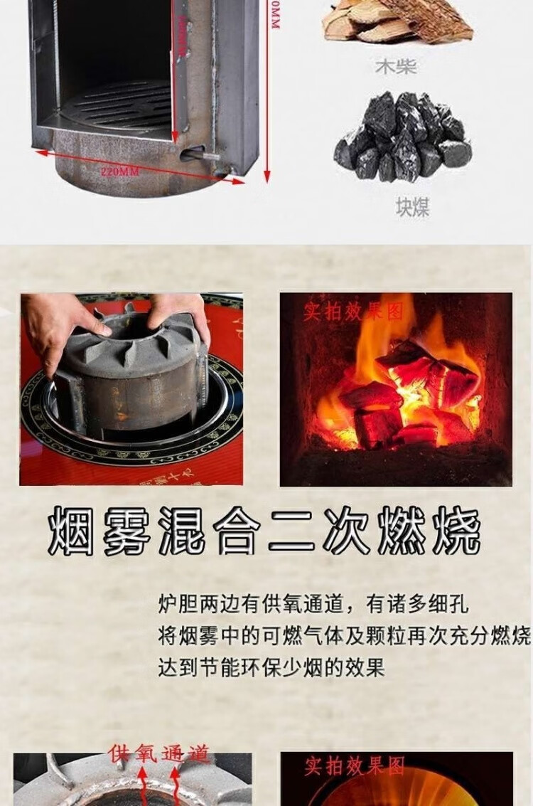 规格:长1.38米x宽0.75米x高0.63米 燃料类型: 固体燃料,烧柴,烧有烟煤,煤要求烧完是那种白色的灰,不能烧生物质颗粒,不能,不可以烧钢煤,金沙煤!!!。链接图片只是款式花色参考 炉子以实物为准(炉子非工艺,加上物流运输,产品无法做到精细完美),介意慎拍 新疆 西藏 内蒙需补运费差价 请认真阅读说明书 内胆锥形炉膛设计有利于燃料充分燃烧。通过二次进风管道加入高温预热二次供氧技术后,第一次燃烧后所产生的烟雾(一氧化碳、碳微粒粉尘等),再次聚集到上口同高温空气进行混合二次燃烧,燃烧更彻底,烟囱无明显烟雾排放,节能效果比普通炉具高出40%