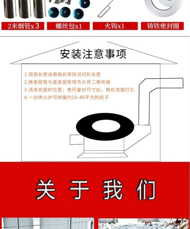 规格:长1.38米x宽0.75米x高0.63米,安装时,横烟管请不要拐弯,默认发不带摇灰杆的 燃料类型: 固体燃料,烧柴,烧有烟煤,煤要求烧完是那种白色的灰,不能烧生物质颗粒,不能,不可以烧钢煤,金沙煤!!!。链接图片只是款式花色参考 炉子以实物为准(炉子非工艺,加上物流运输,产品无法做到精细完美),介意慎拍 请认真阅读说明书 内胆锥形炉膛设计有利于燃料充分燃烧。通过二次进风管道加入高温预热二次供氧技术后,第一次燃烧后所产生的烟雾(一氧化碳、碳微粒粉尘等),再次聚集到上口同高温空气进行混合二次燃烧,燃烧更彻底,烟囱无明显烟雾排放,节能效果比普通炉具高出40%