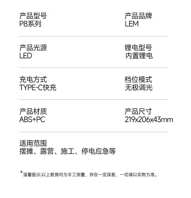 LEM露营灯超长续航强光充电超亮户外工地球场夜市营地照明投光灯 [P8标准版]80-3000LM无极调光/12