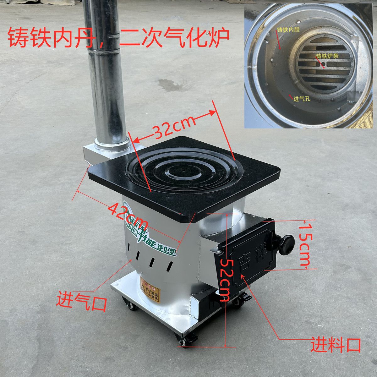 玮贤精品柴煤两用柴火炉灶铸铁内胆二次进气移动家用加厚无烟汽化炉 气化柴煤两用炉带轮子