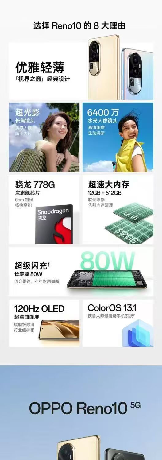 OPPOReno10 新品高通骁龙778G 80W闪充 6400万水光人像 120Hz 5G 手机 溢彩蓝 12+256 单机+第三方品牌快充+店保一年