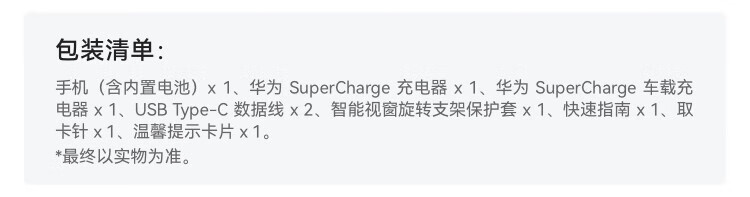 手机(含内置电池)x1; 华为充电器x1; 华为车载充电器 x1; 数据线 x2; 智能视窗旋转支架保护套 x 1; 快速指南 x1; 取卡针 x 1; 温馨提示卡片 x1; *最终以实物为准