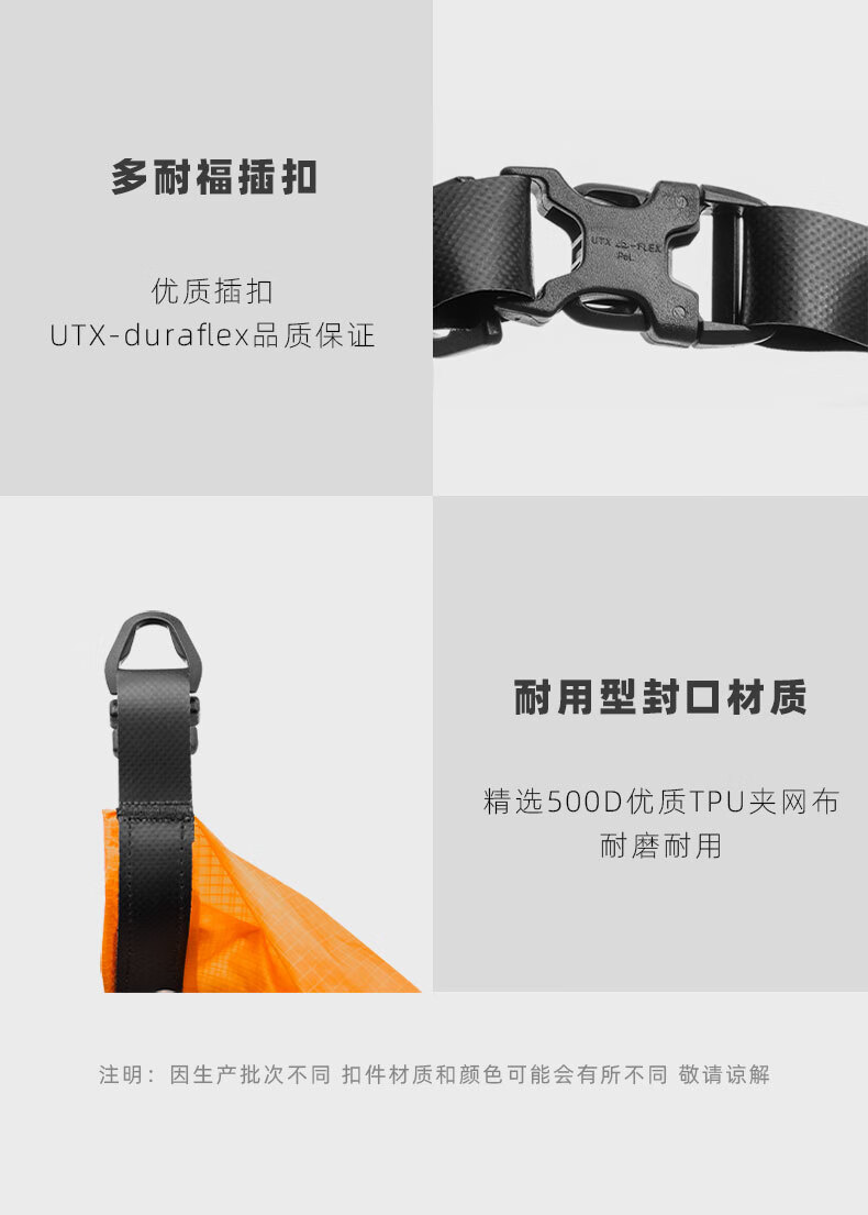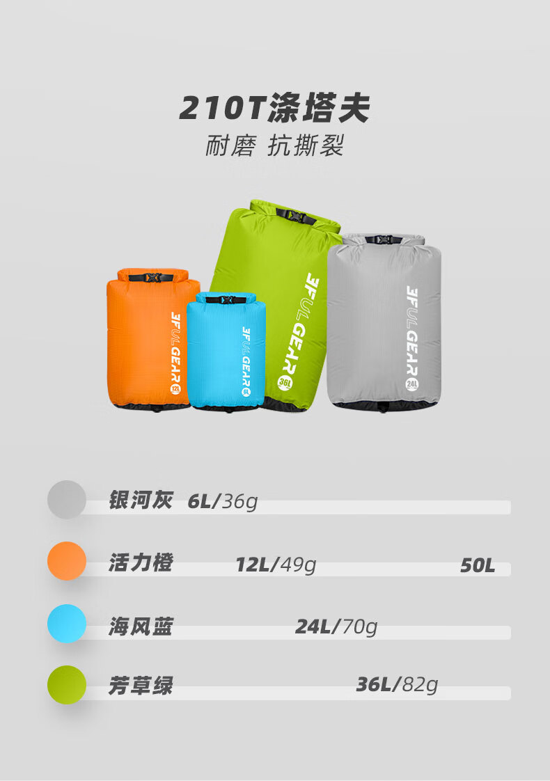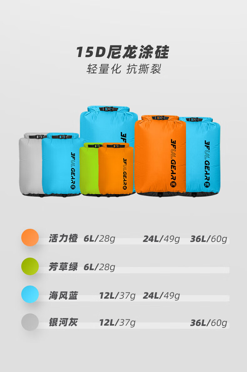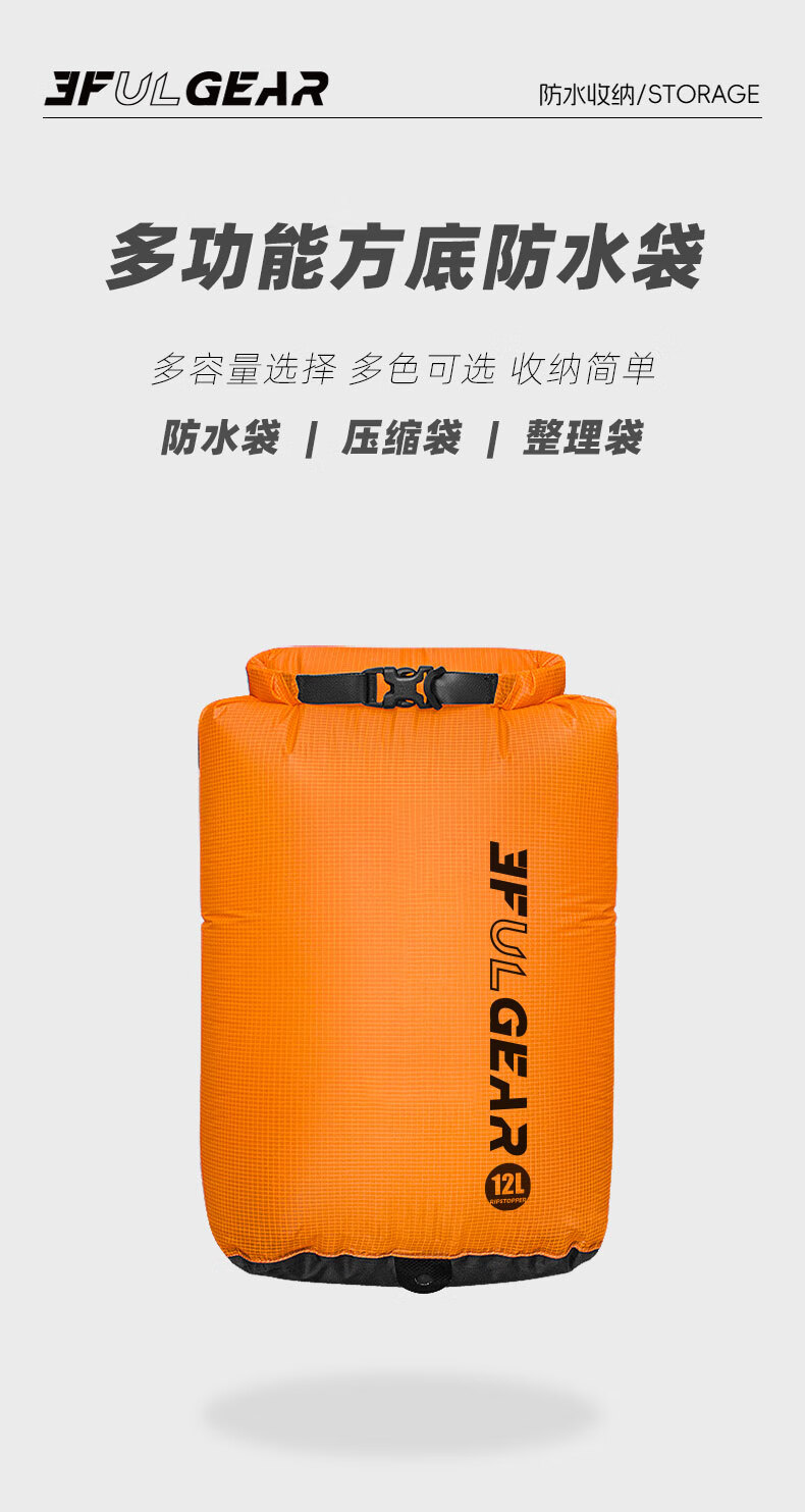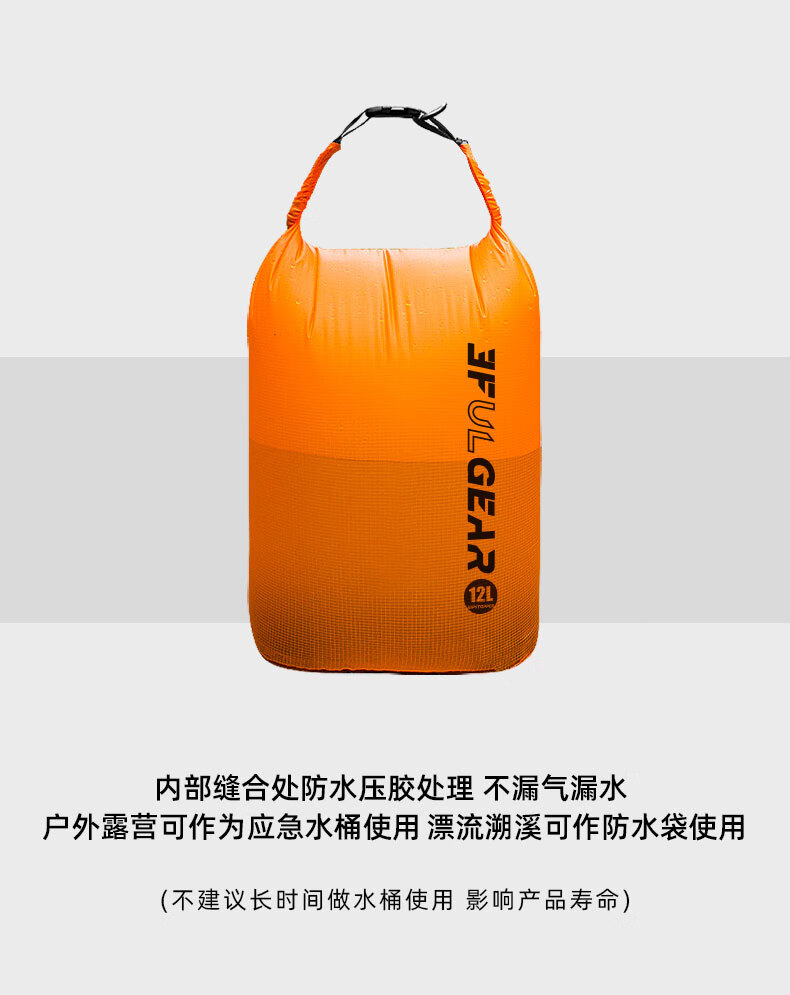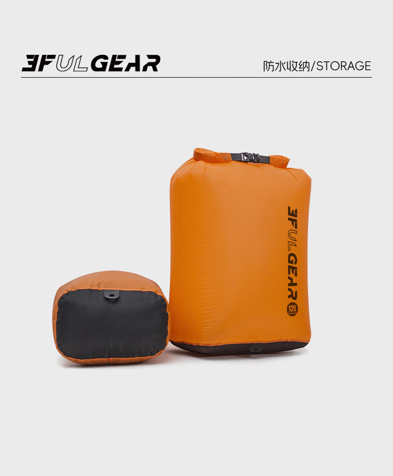 三峰出防水袋12L 便携性能:轻量的防水袋,防水性能待我拿去雪山实地验证。 产品材质:15D尼龙涂硅。 其他特色:桔色啥时候能补货,蓝色的颜值没桔子高哈哈。