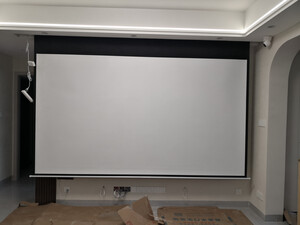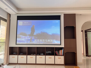 新家定制柜子装修前就计划好了要安装幕布,所以一早就预留了电和位置安装,安装上效果很喜欢,要是有110寸就更赞了,我这个位置装120又不够预留了宽度忘记了长度。120的效果会更好。