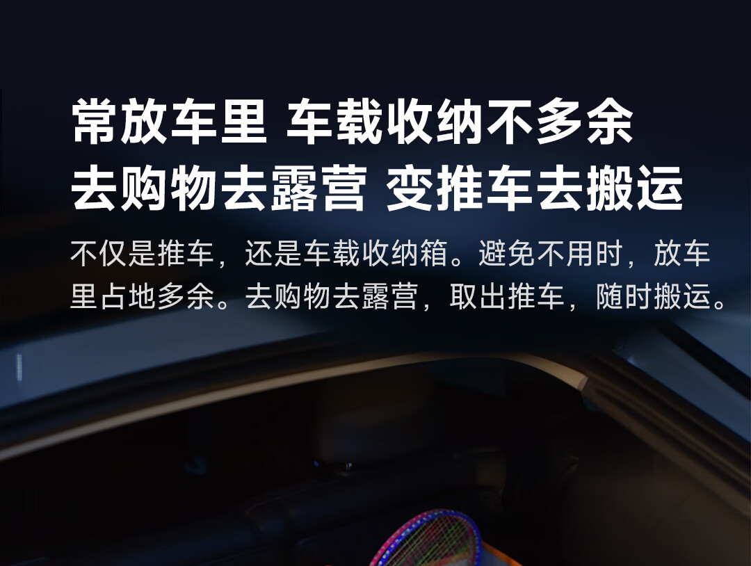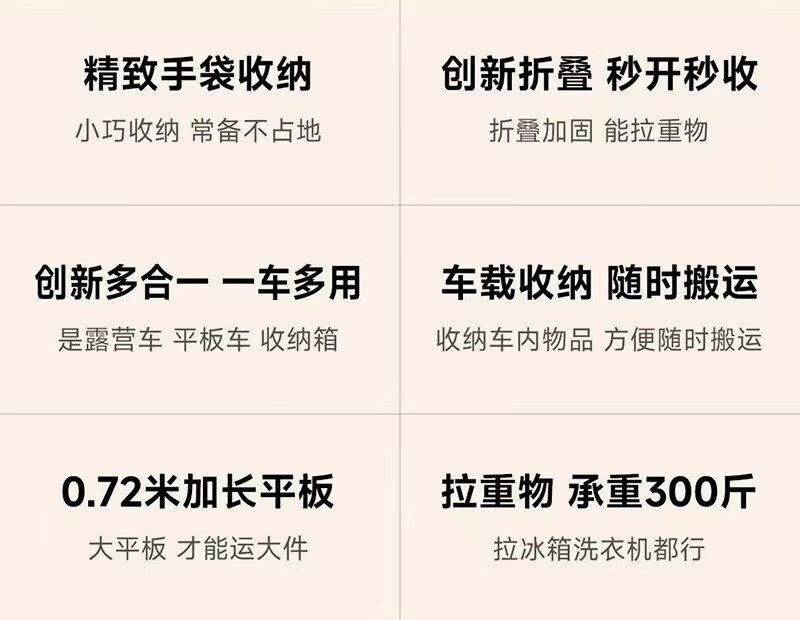 心心念念的多功能便携车昨晚上下单,今天下午就收到了,和介绍图片一致,很喜欢,希望能经用,使用后,再来追评
