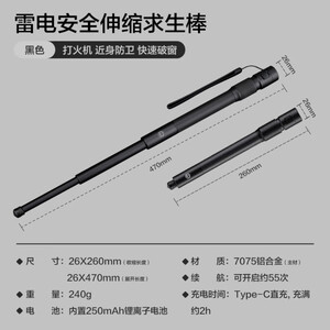 包装彩盒1个,雷电安全伸缩求生棒1根,Type-C充电线1条,手绳1条,说明书1份