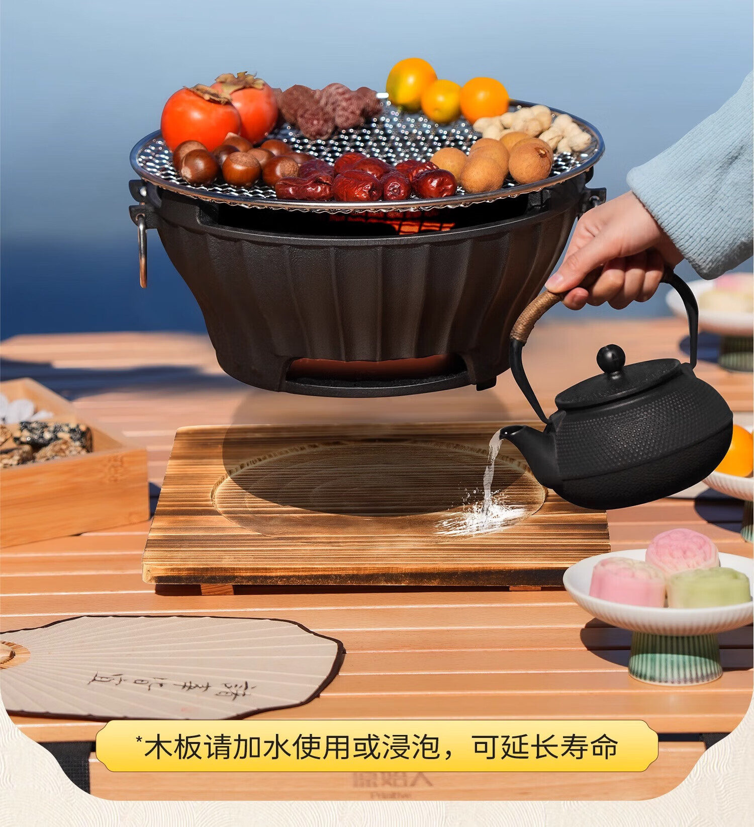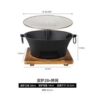 Nobana户外露营煮茶取暖炉铸铁碳炉野营家用木炭烧烤BBQ烤肉火锅碳烤炉 AHUI137 加大号28cm碳炉+木底座+圆形烤网30.5cm