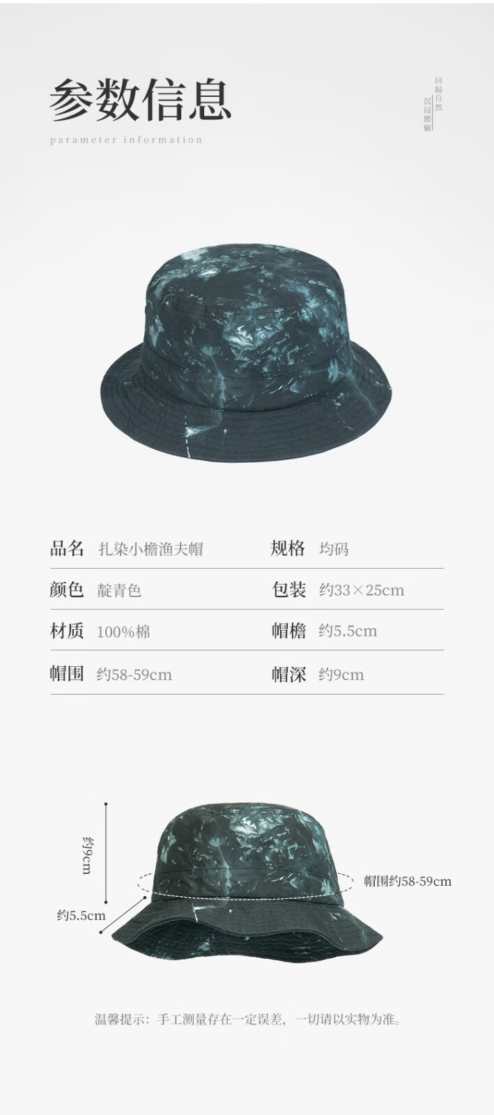 帽子用品牌塑料袋进行外包装,内有透明塑料袋,包装的很严密,物流也挺快。帽型好,帽沿比较挺括,戴着舒适好看。图片是洗后拍的,不掉色,无异味,扎染也很自然,比单色多了一点趣味,个人很喜欢。