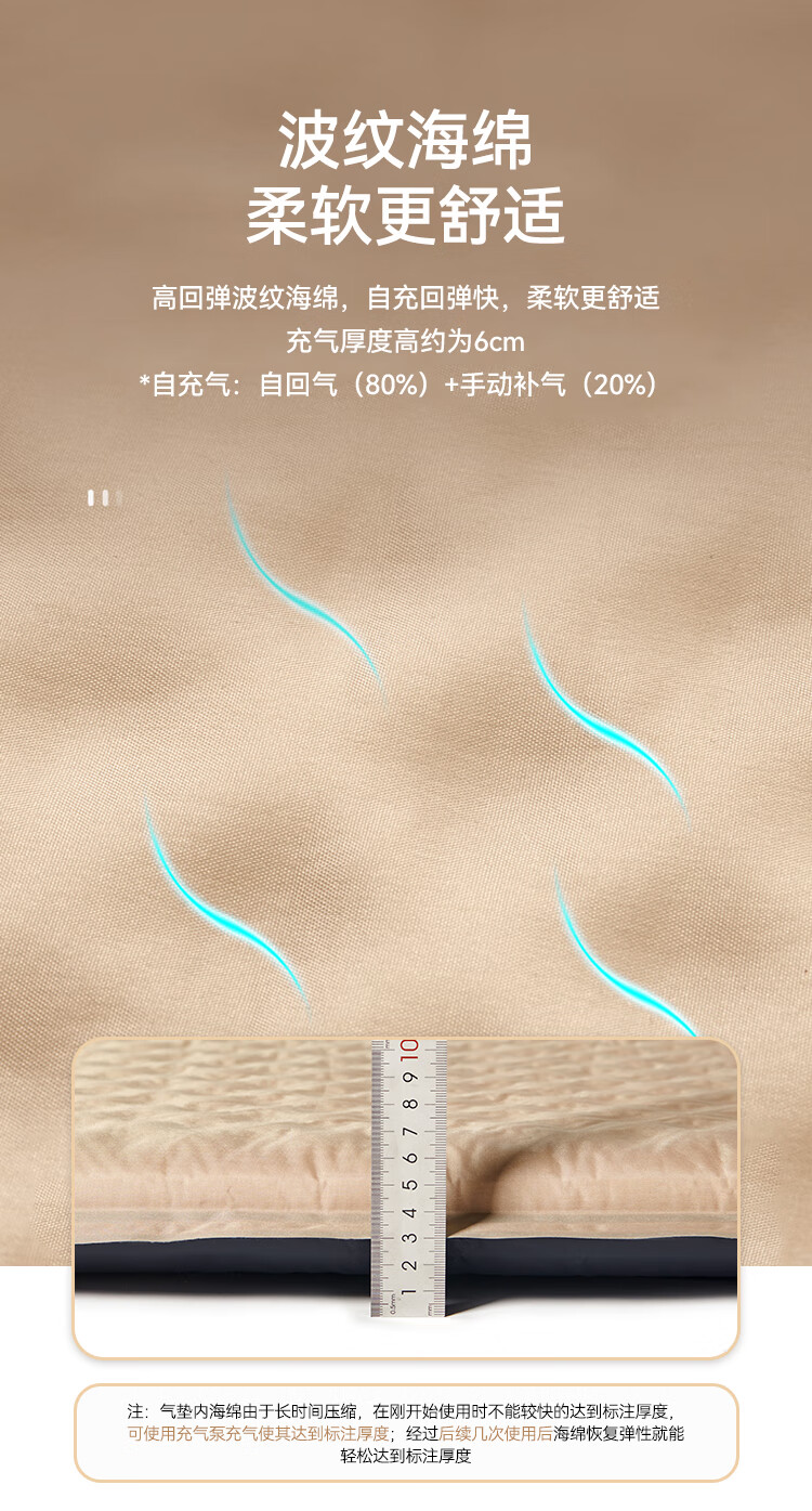 这个厚度有6cm,相对厚实,尤其打开气孔自充气的速度很快,收纳卷起来也快捷方便,一般地面干燥湿气不重的地方,露营带出去够用了