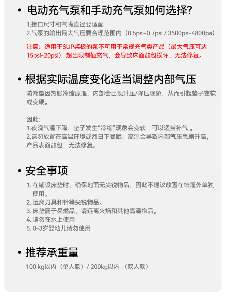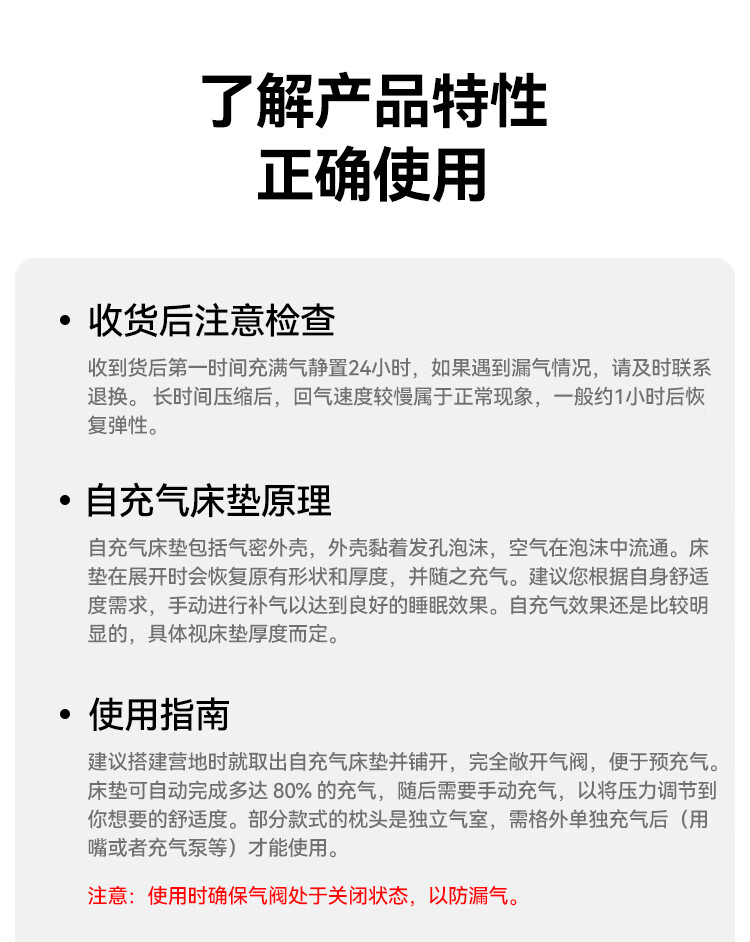 便捷充气跟放气,厚度一般,充上气睡着也OK,四个充气口满足了不同使用场景,收纳起来也很方便,材质清洁起来也很容易,已经放在了车上当床用了。