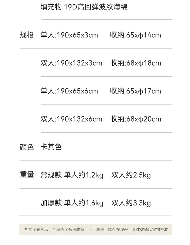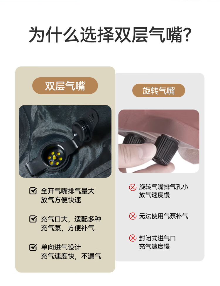 设计的很巧妙,新一代的充气放气口很实用,而且3厘米就已经很舒服了我觉得挺好用的,颜色也很百搭,比较耐脏,非常不错的一次购物体验,特别是京东物流非常快当天下单第二天就到了防水效果也很不错不会漏水的 防水效果:很好 适用场景:任何地方