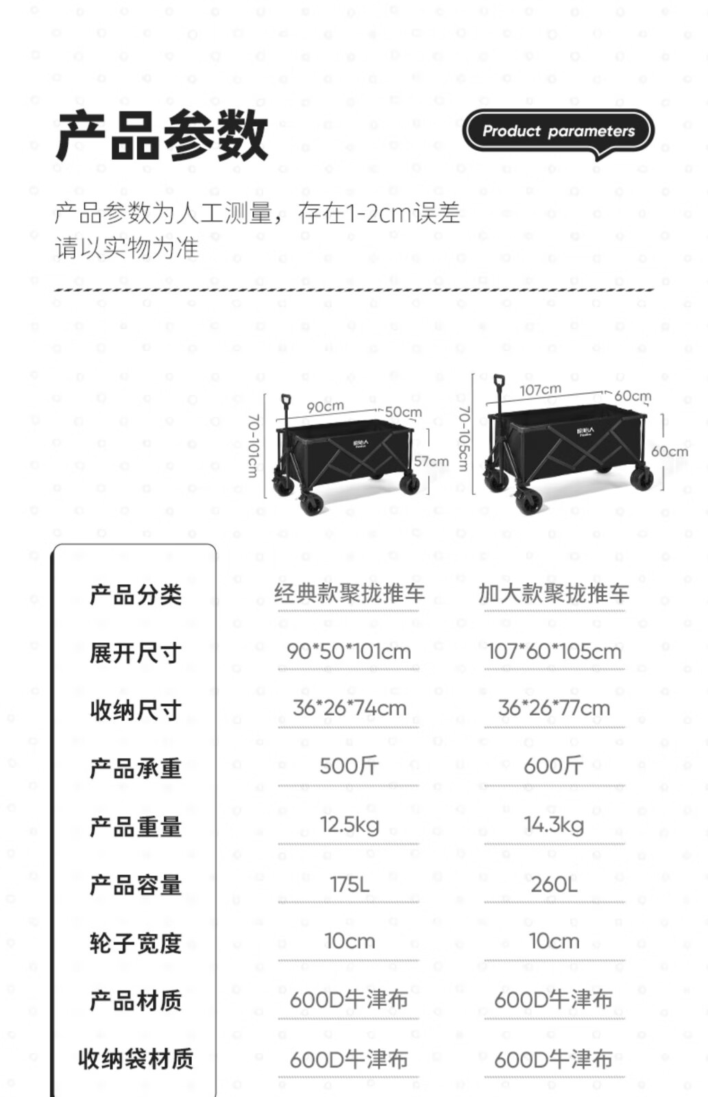 原始人露营推车超大营地拖车可折叠户外小拉车手推野营野餐手拉车 260L 加大曜黑【轮宽10cm可拆卸】