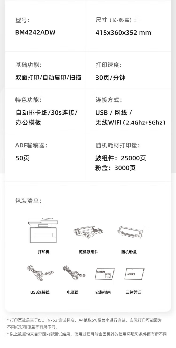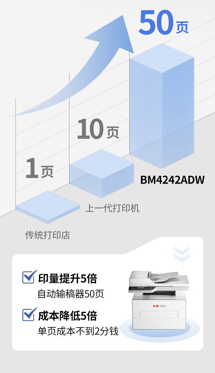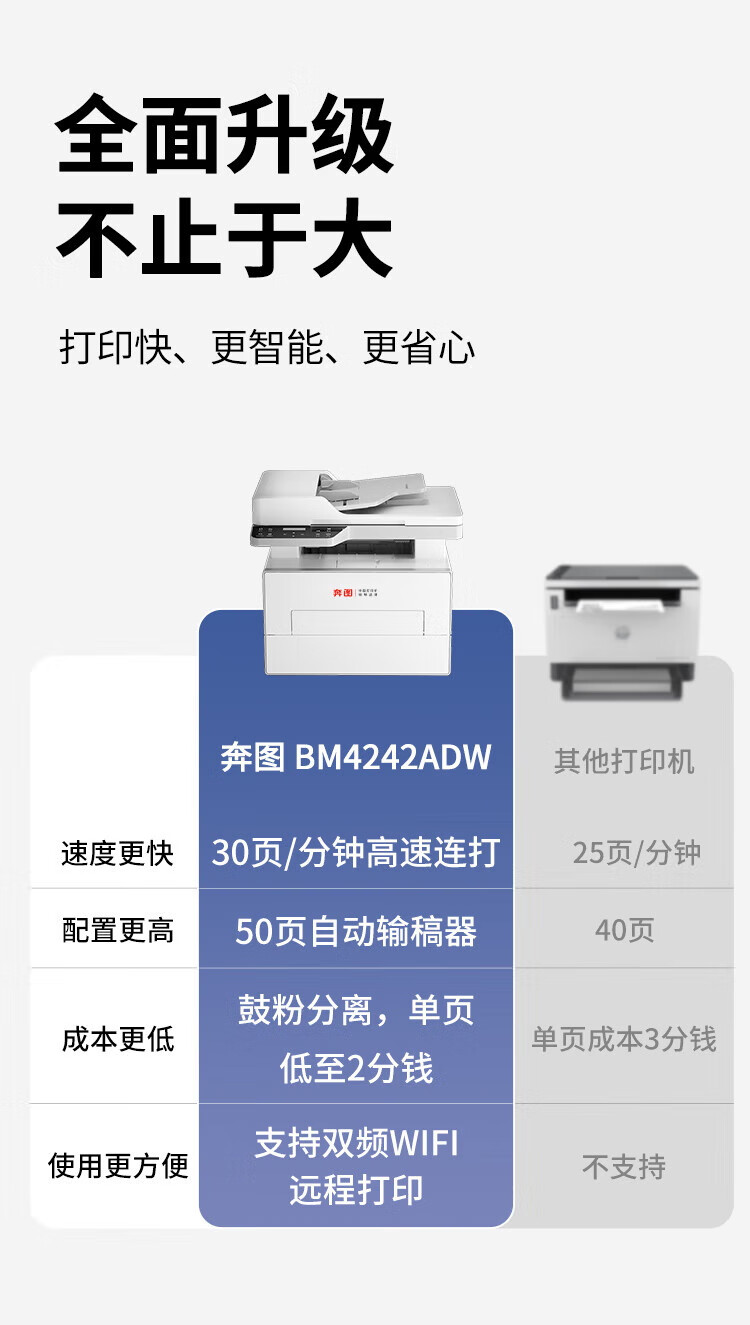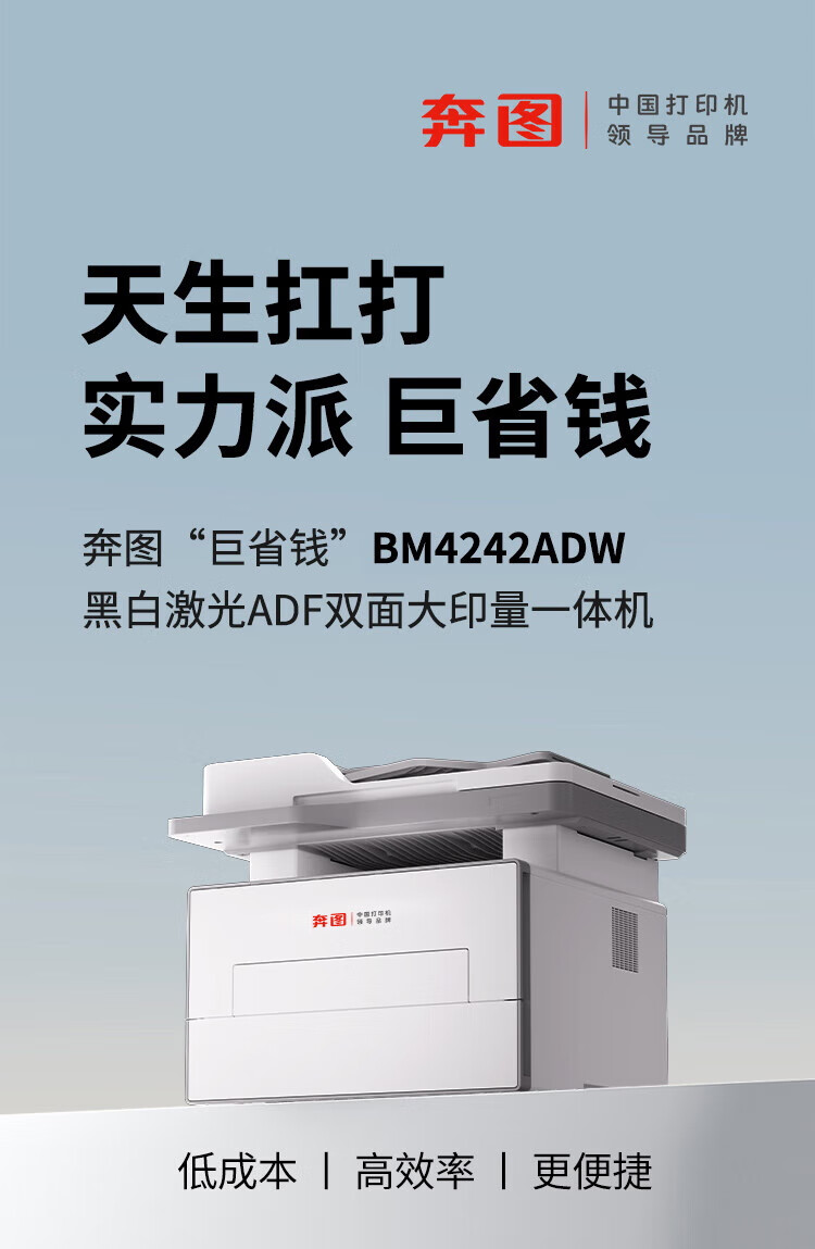 奔图 PANTUMBM4242ADW激光黑白打印复印扫描一体机自动双面打印连续复印扫描一体机50页输稿器5G连接30页/分钟 原装T0-4202H(3000页)粉盒一支